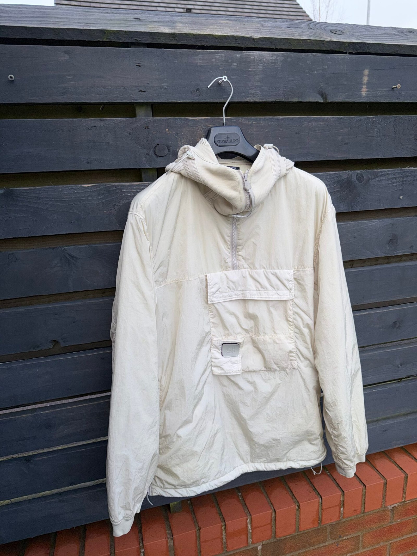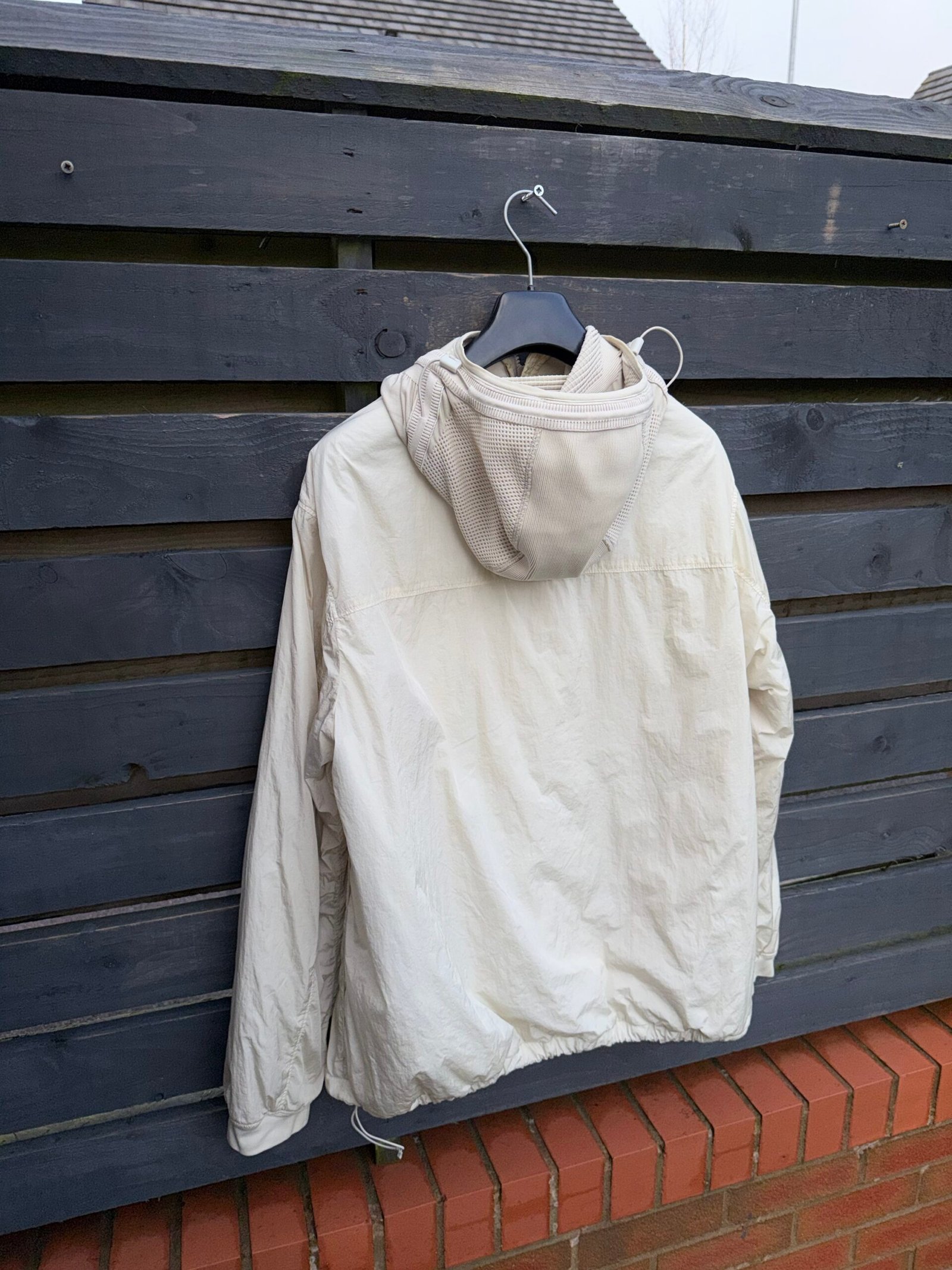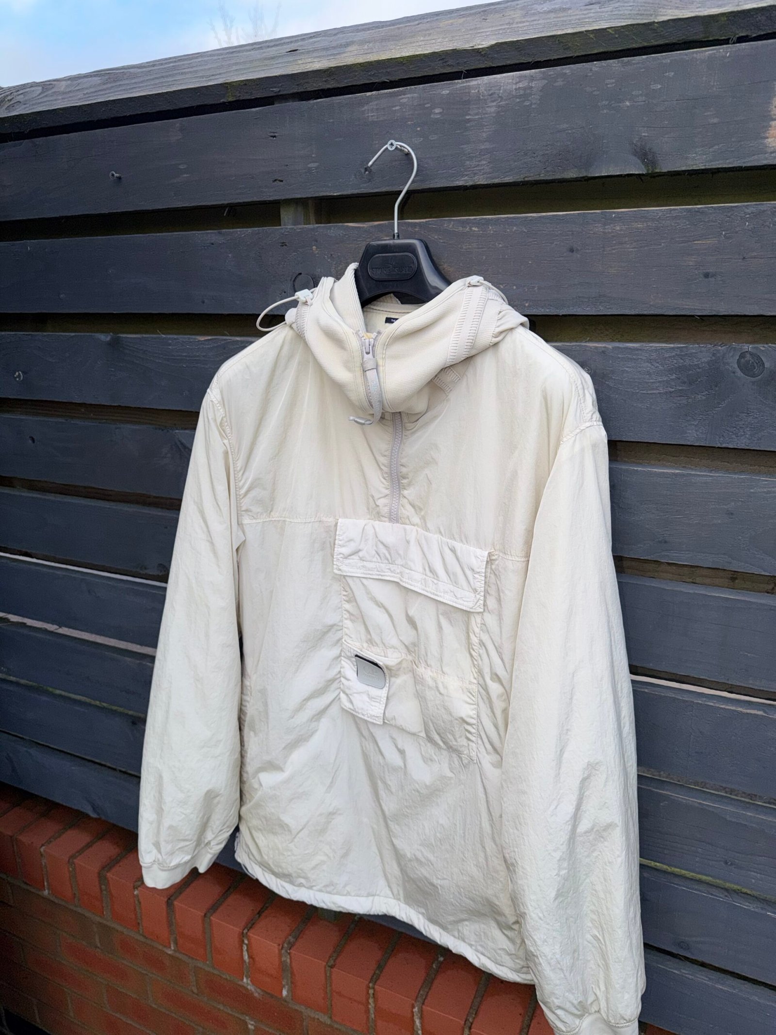 A standout technical smock from C.P. Company’s Metropolis line crafted in Chrome‑R, a recycled multifilament nylon that’s durable, garment‑dyed, and subtly weather‑resistant. Featuring a relaxed pullover silhouette with a quarter‑zip, ventilated hood, adjustable hem and hood, and practical utility pockets, it blends functional design with modern urban style. With quilted insulation for added warmth and the brand’s signature utilitarian touches like a bold logo patch, this smock is perfect for layering or as a statement outer layer in transitional weather. Very good condition. Please Note this item is pre-owned and may show minor signs of wear.