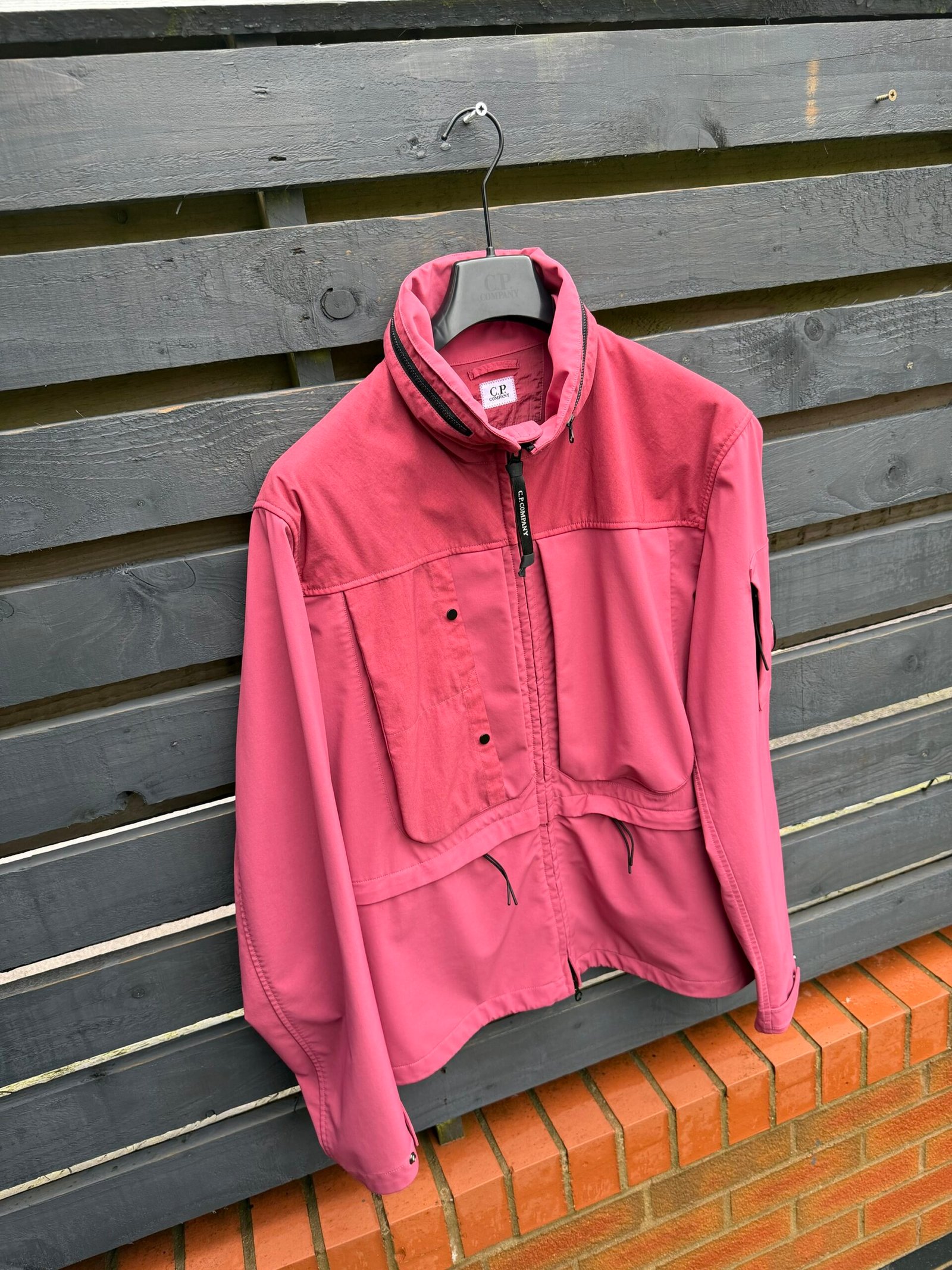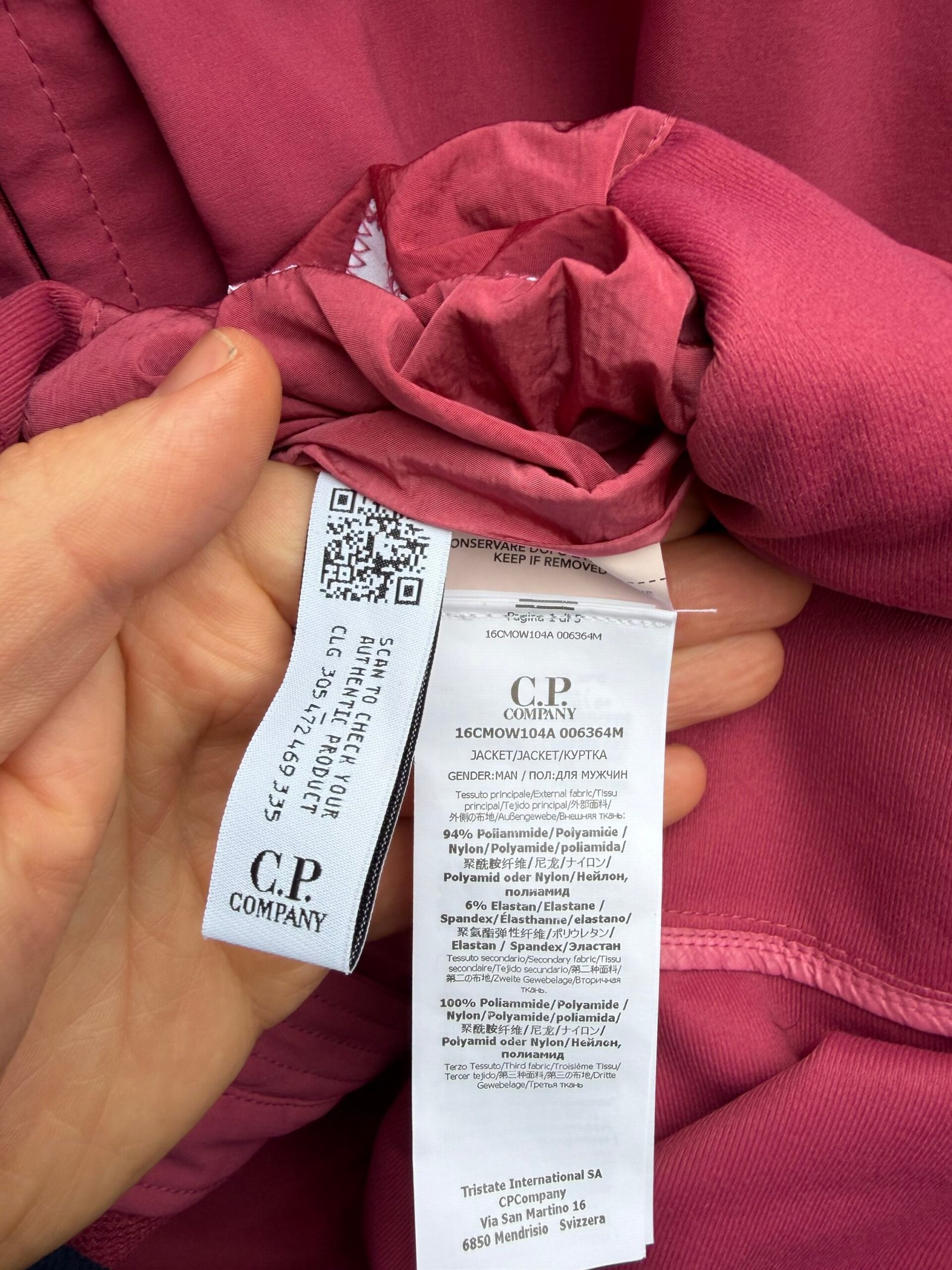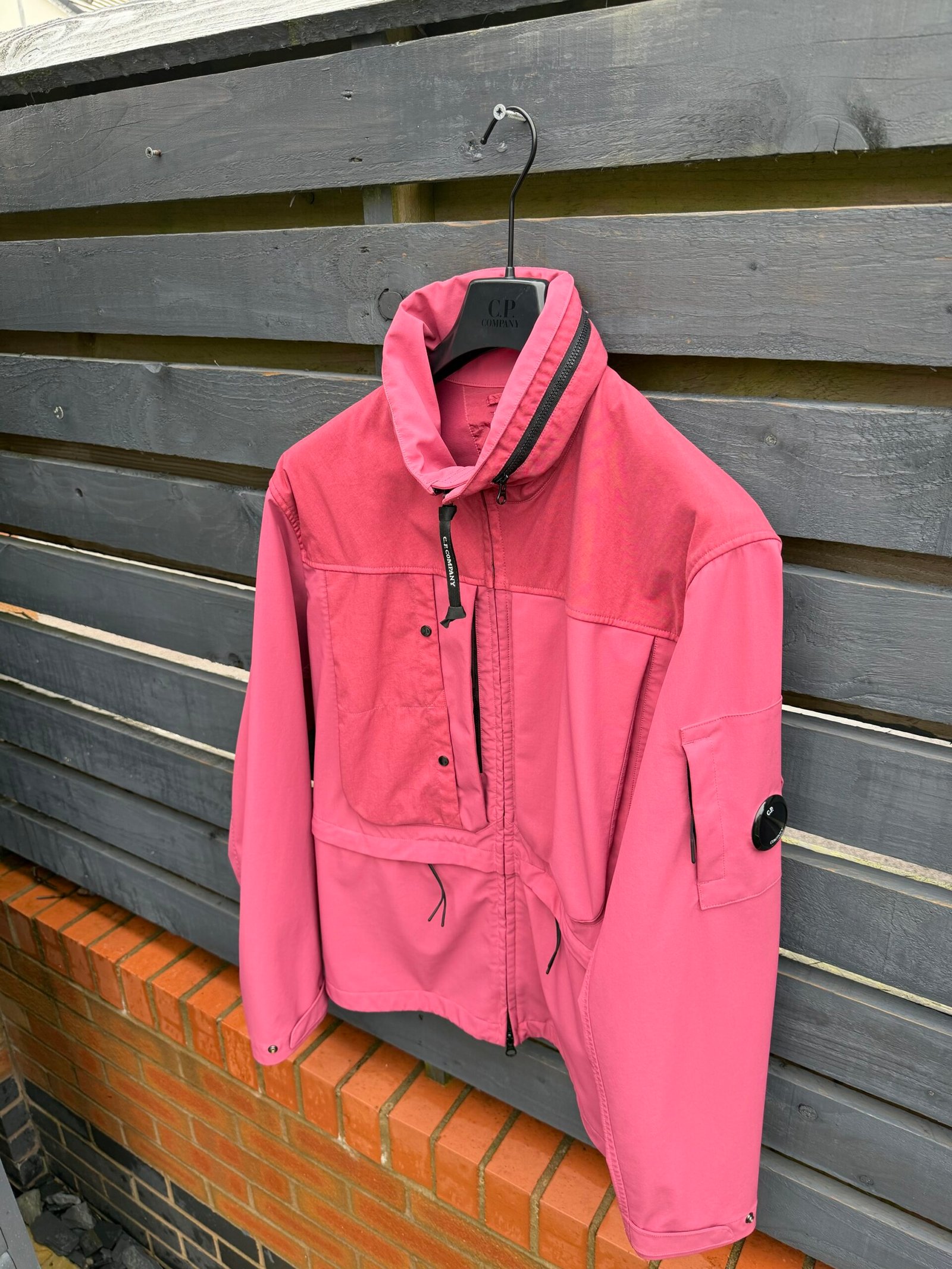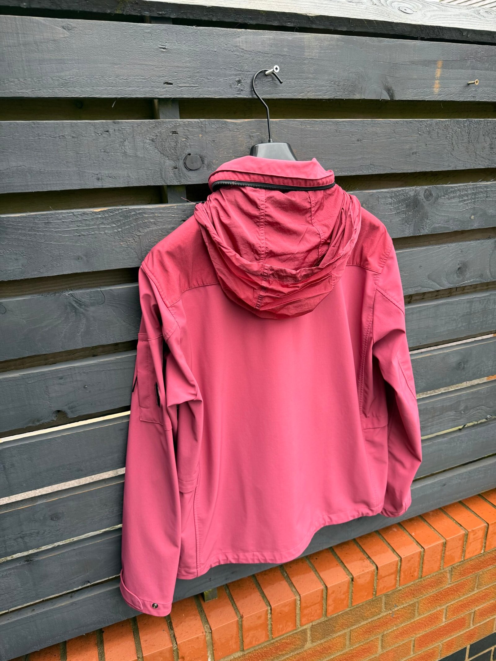 C.P. Company GD Shell Goggle Jacket – Pink. Engineered in a 3‑layer soft‑shell fabric, this piece features the signature goggle hood, full zip front, two external and two internal pockets, elasticated cuffs, and an adjustable hem and hood for optimal fit. Nylon shell with water‑resistant finish. A standout designer outerwear piece in an eye‑catching pastel pink. Very good condition.