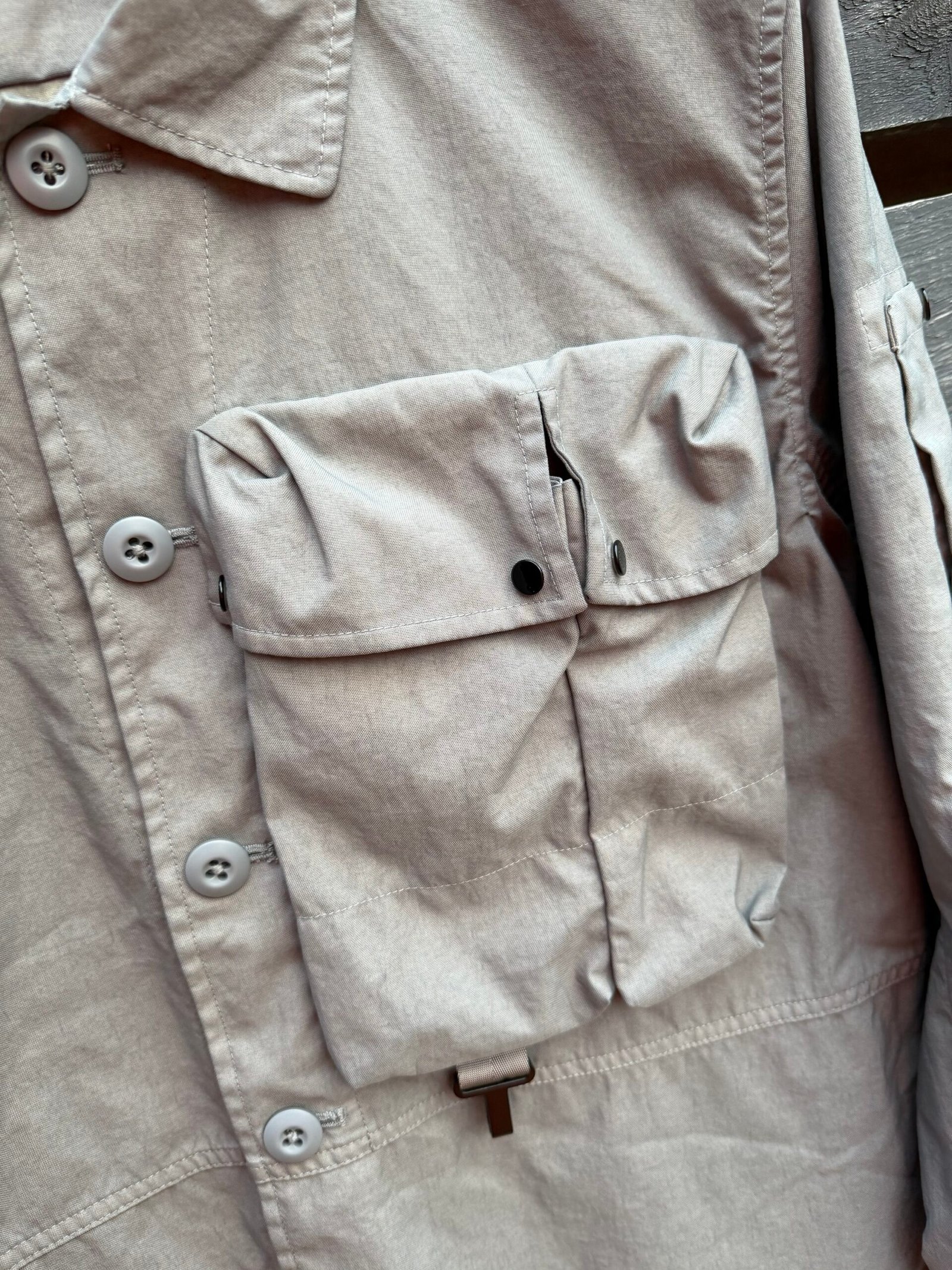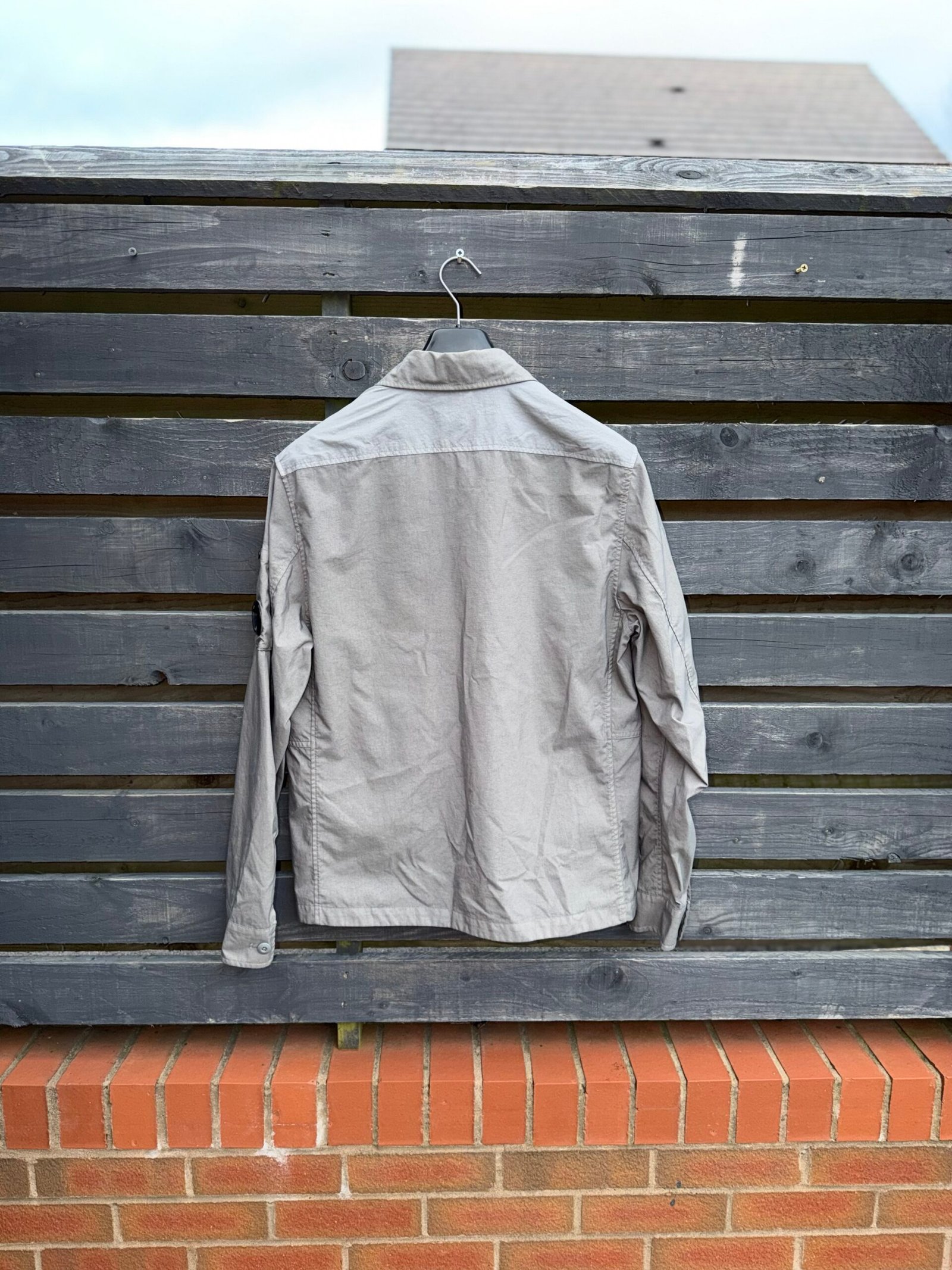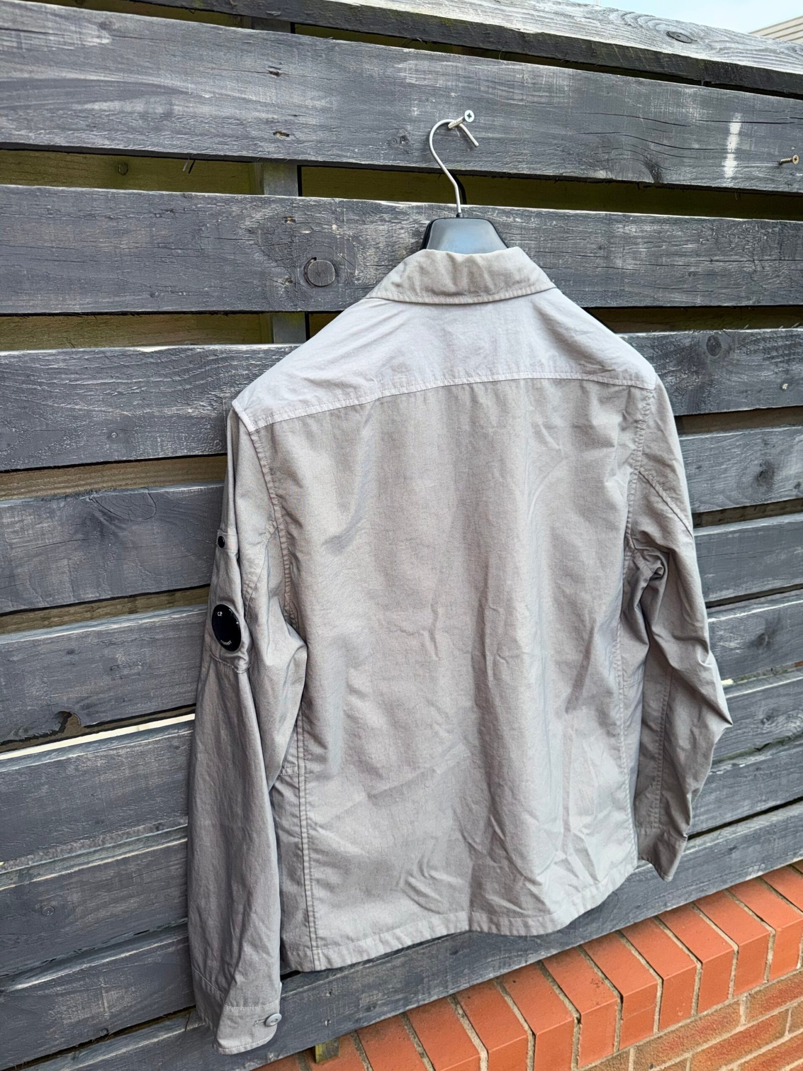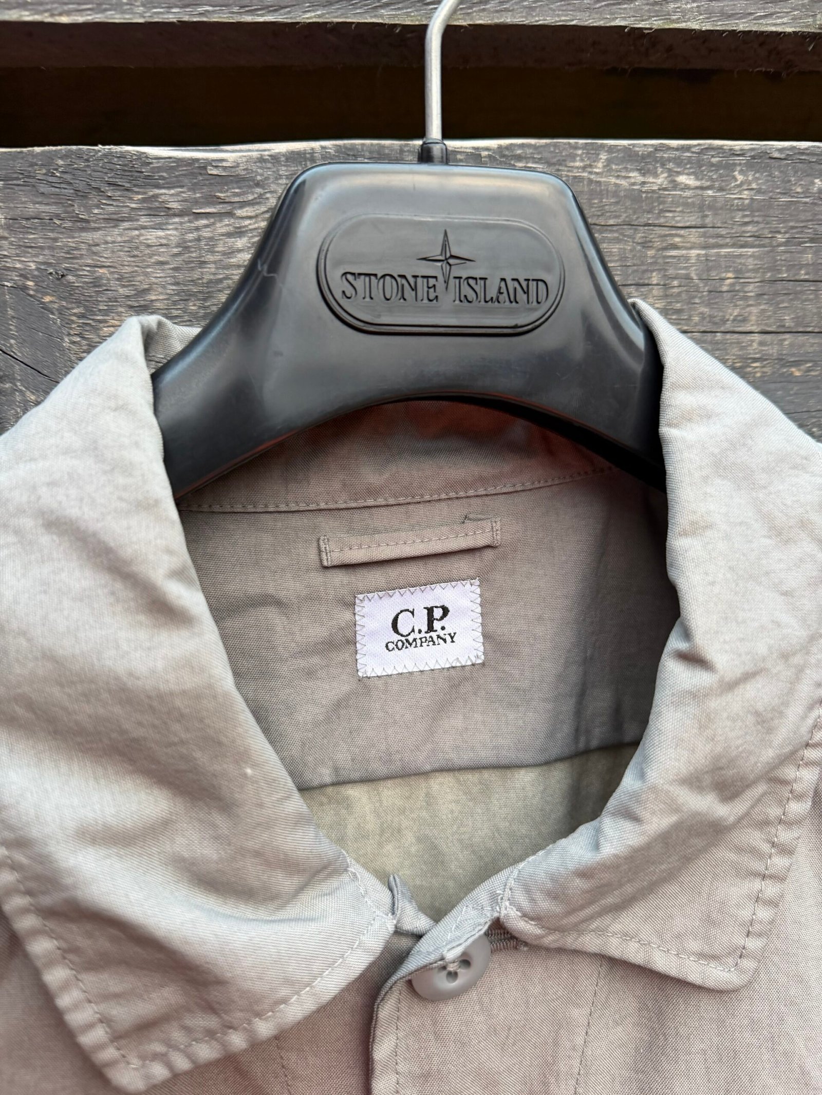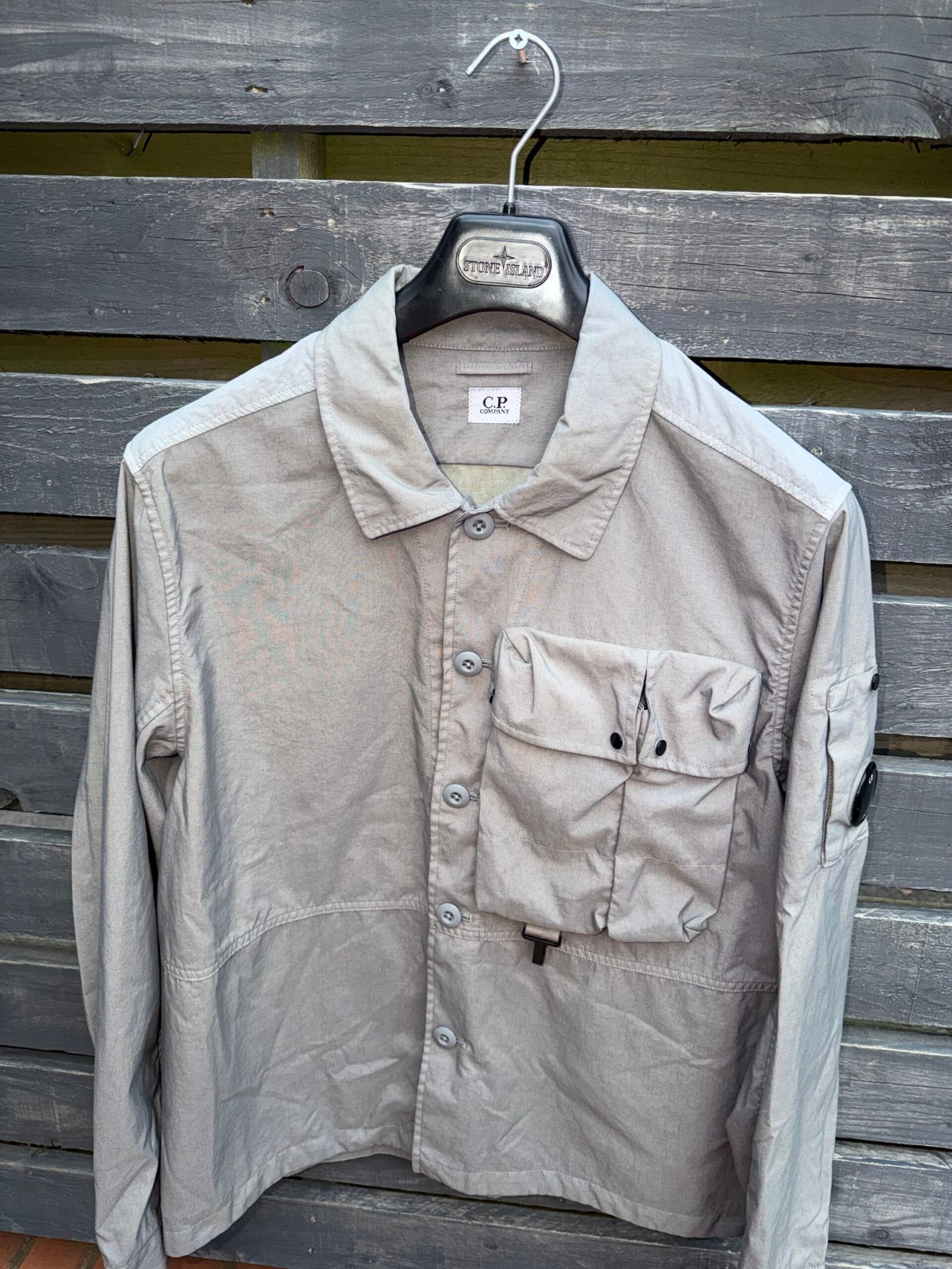 A lightweight technical overshirt made from Taylon P — a durable, taslanised nylon that blends a matte finish with subtle texture. Garment-dyed for rich, tonal depth, it features practical pocket detailing and the signature C.P. lens on the sleeve. A versatile, weather-ready layer with a clean, modern look. Very good condition.
