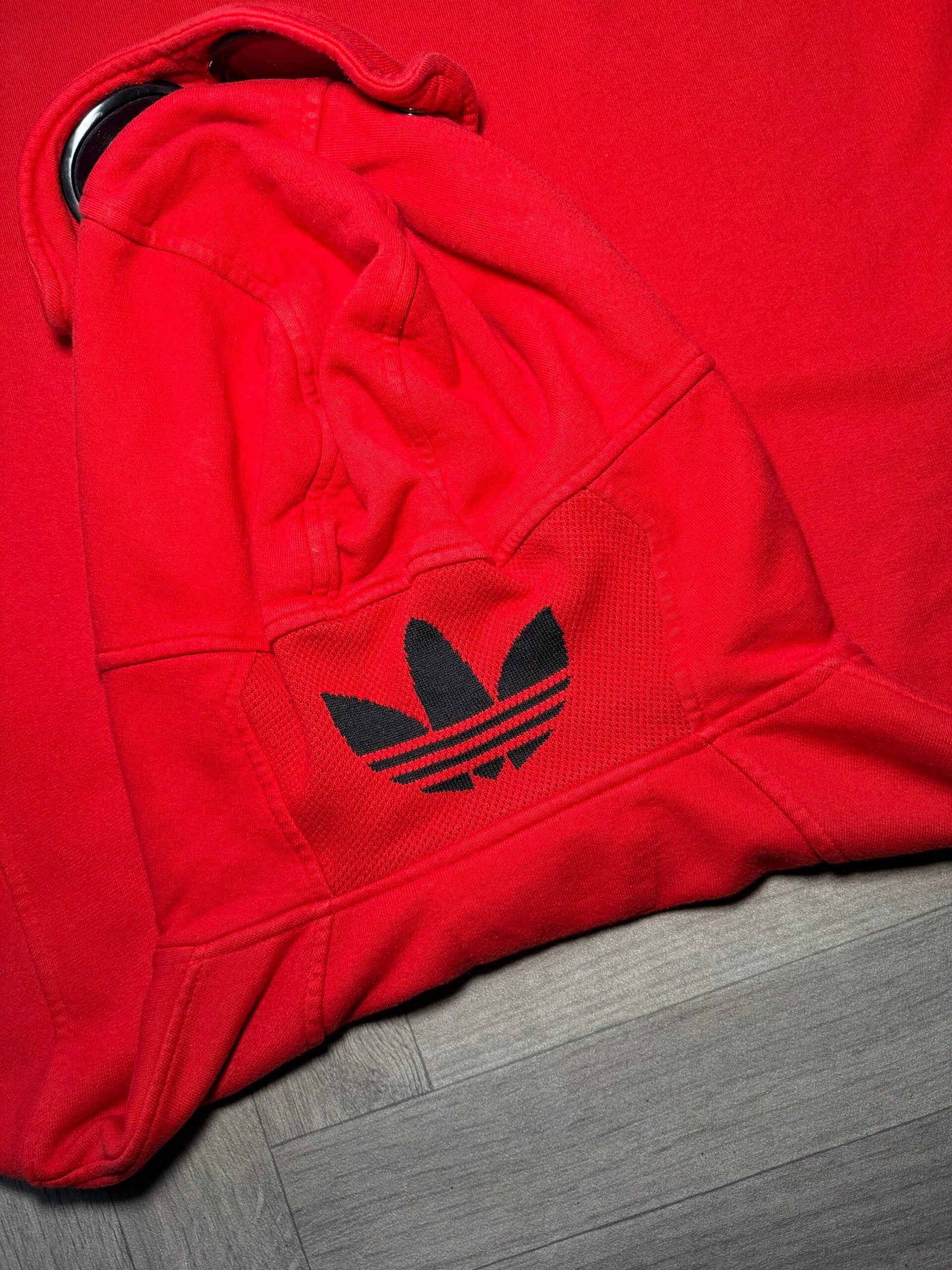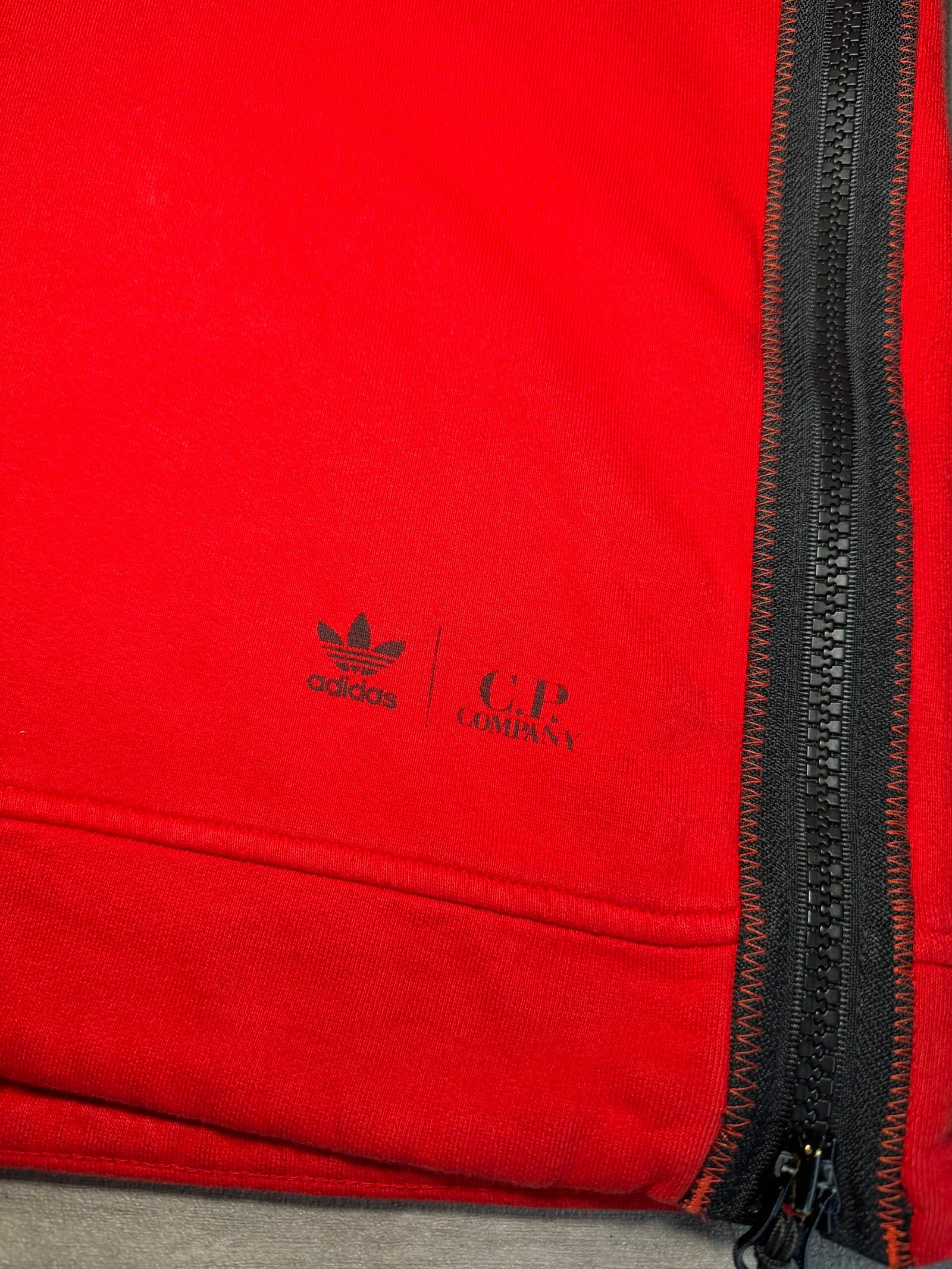 A collaborative hoodie combining adidas’s sporty heritage with C.P. Company’s iconic goggle‑integrated hood. Made from soft cotton fleece, it features a high neckline, adjustable drawstrings, side-zip detailing, elasticated cuffs, and co-branded logos — a stylish, functional piece with a technical edge. Worn, good condition.