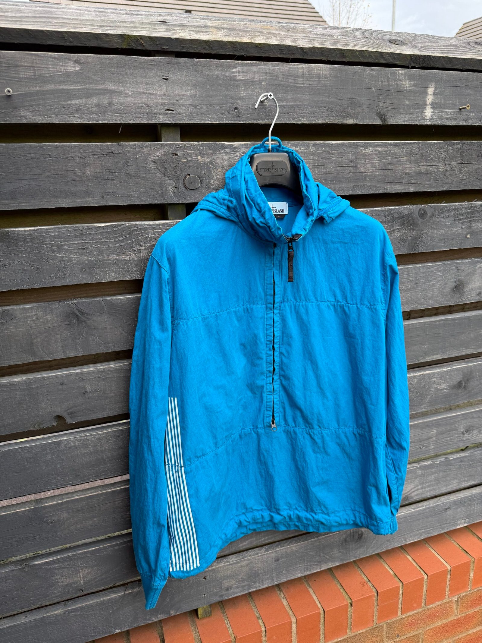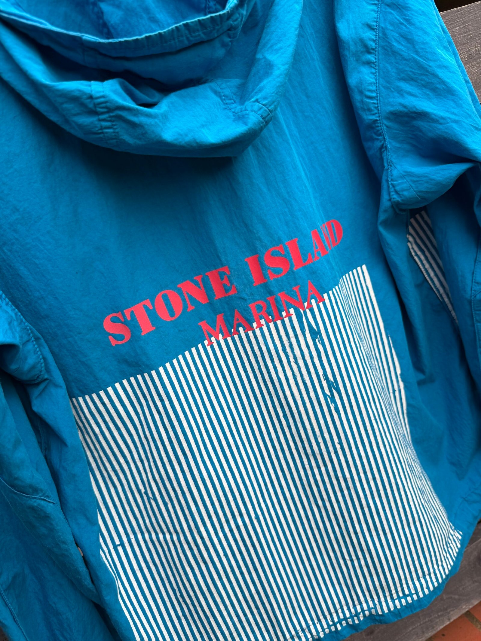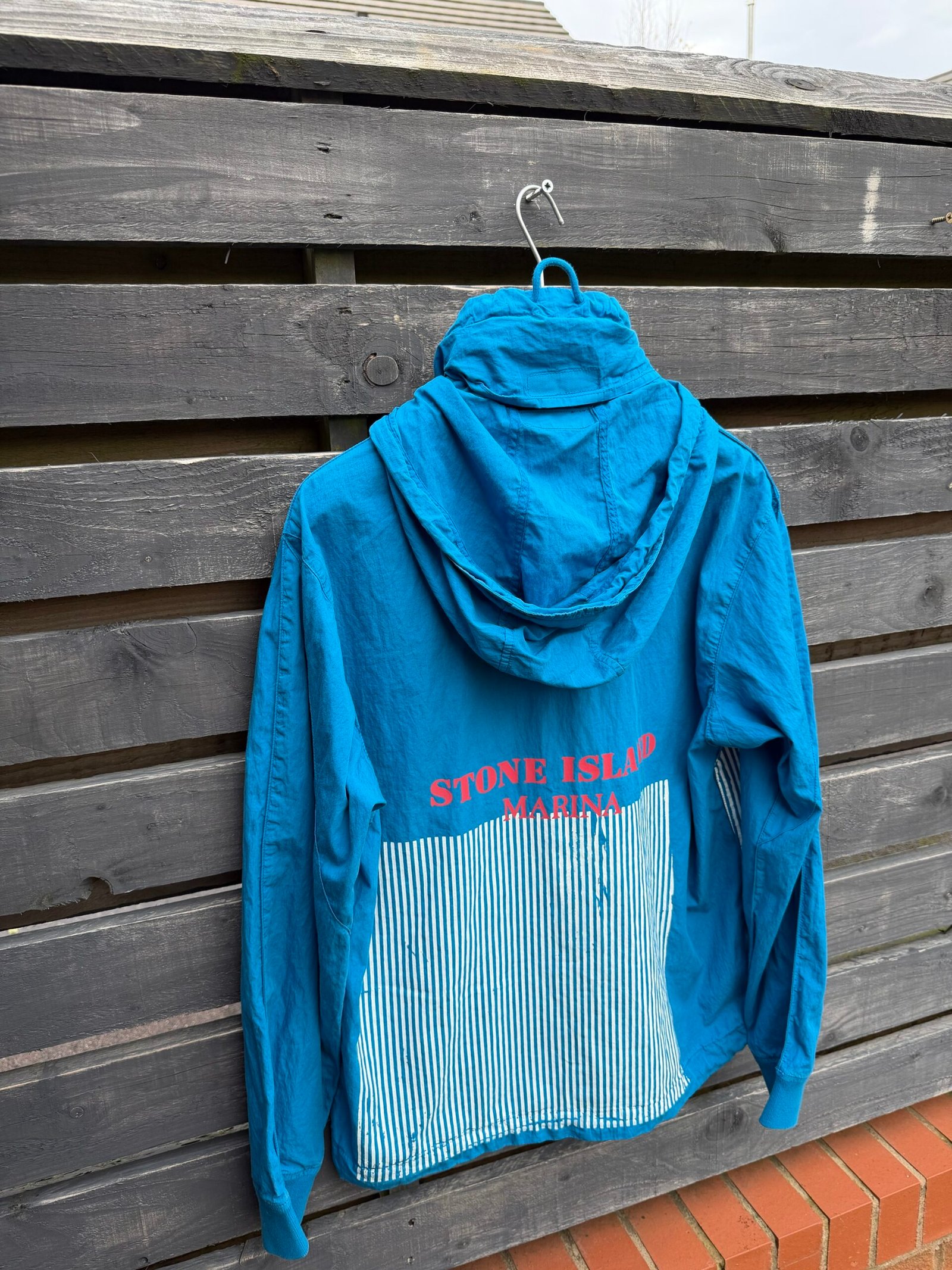An avant‑garde smock from Stone Island’s Marina line (Spring/Summer 2018), this jacket features a lightweight 70% cotton / 30% polyamide shell, a ¾ front zip with concealable hood, and the signature “Marina” folded‑print graphic across the back. Designed for a relaxed, oversized fit with functional weather‑resistant properties, it combines maritime‑inspired utility with bold, statement‑making streetwear style. Worn, good condition.