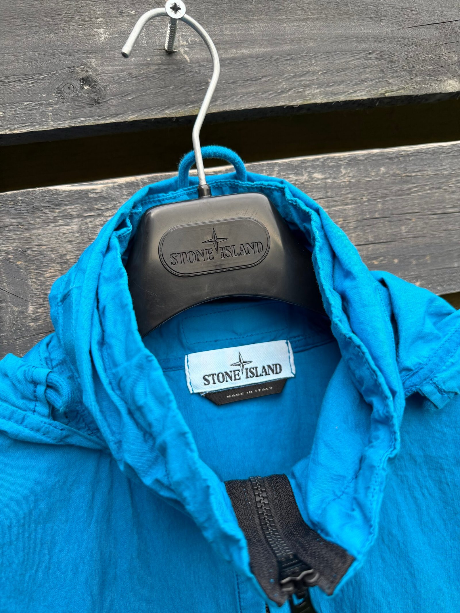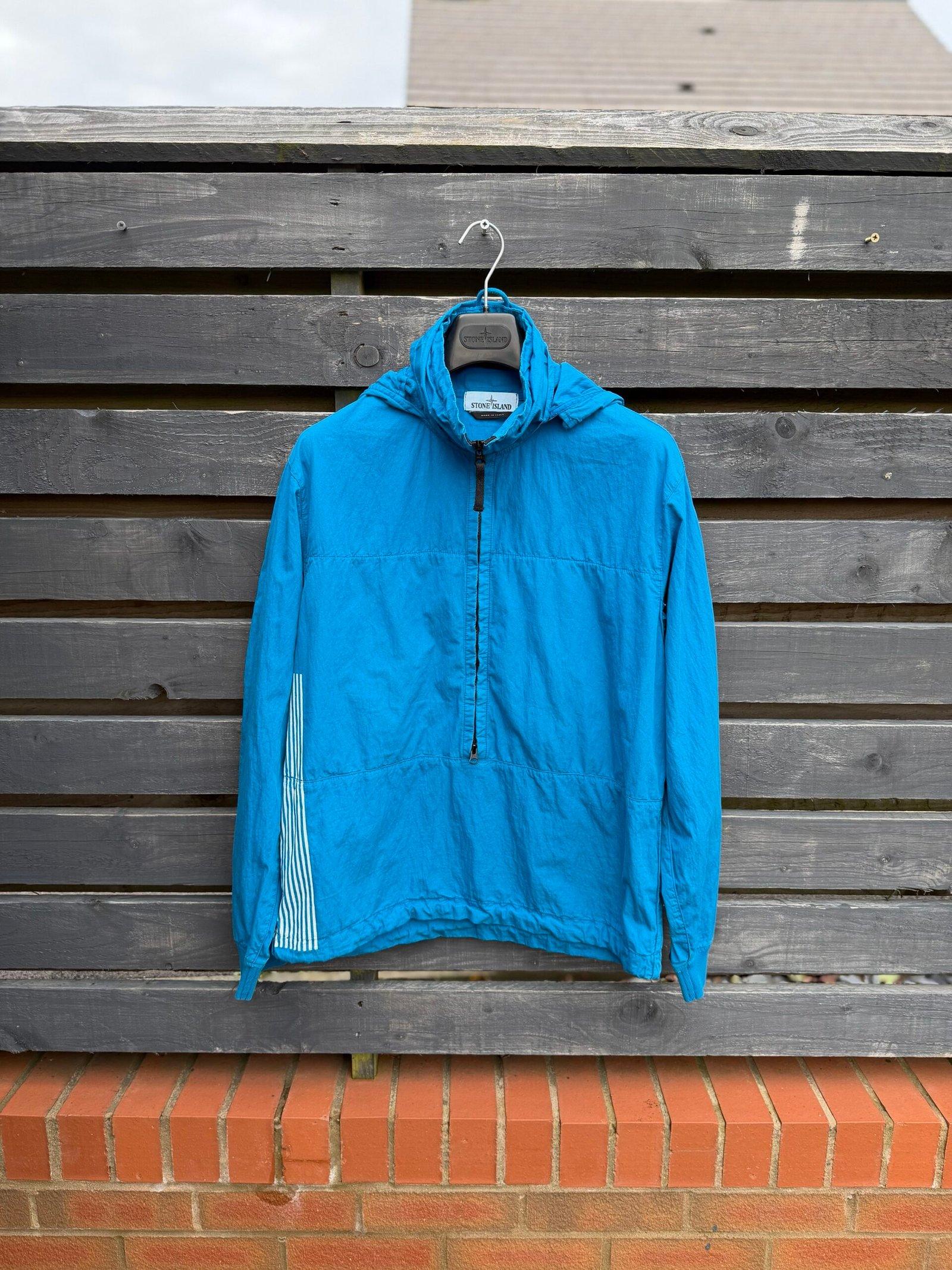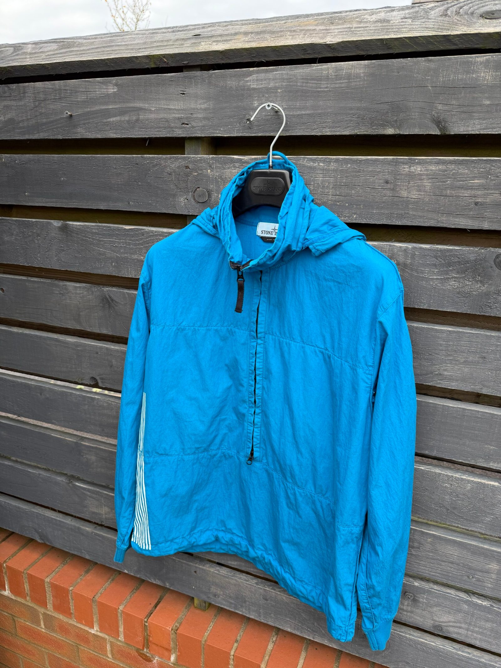 An avant‑garde smock from Stone Island’s Marina line (Spring/Summer 2018), this jacket features a lightweight 70% cotton / 30% polyamide shell, a ¾ front zip with concealable hood, and the signature “Marina” folded‑print graphic across the back. Designed for a relaxed, oversized fit with functional weather‑resistant properties, it combines maritime‑inspired utility with bold, statement‑making streetwear style. Worn, good condition.