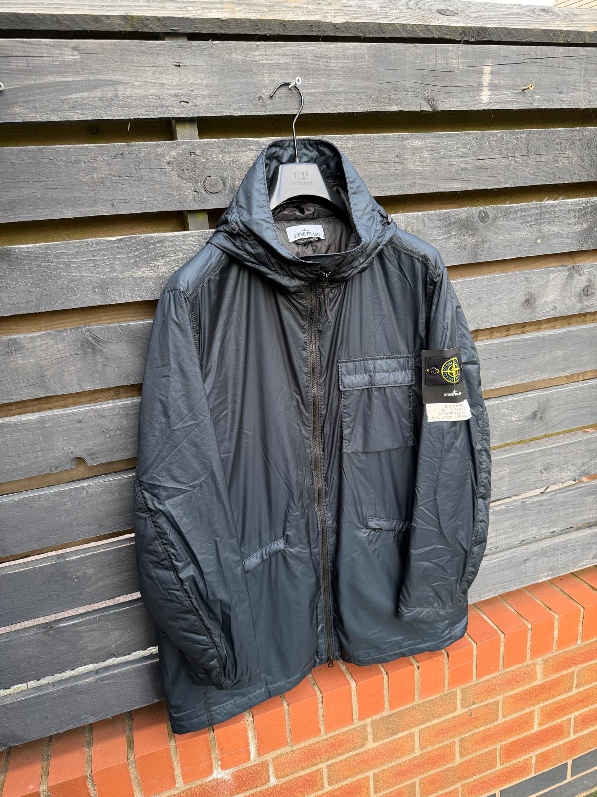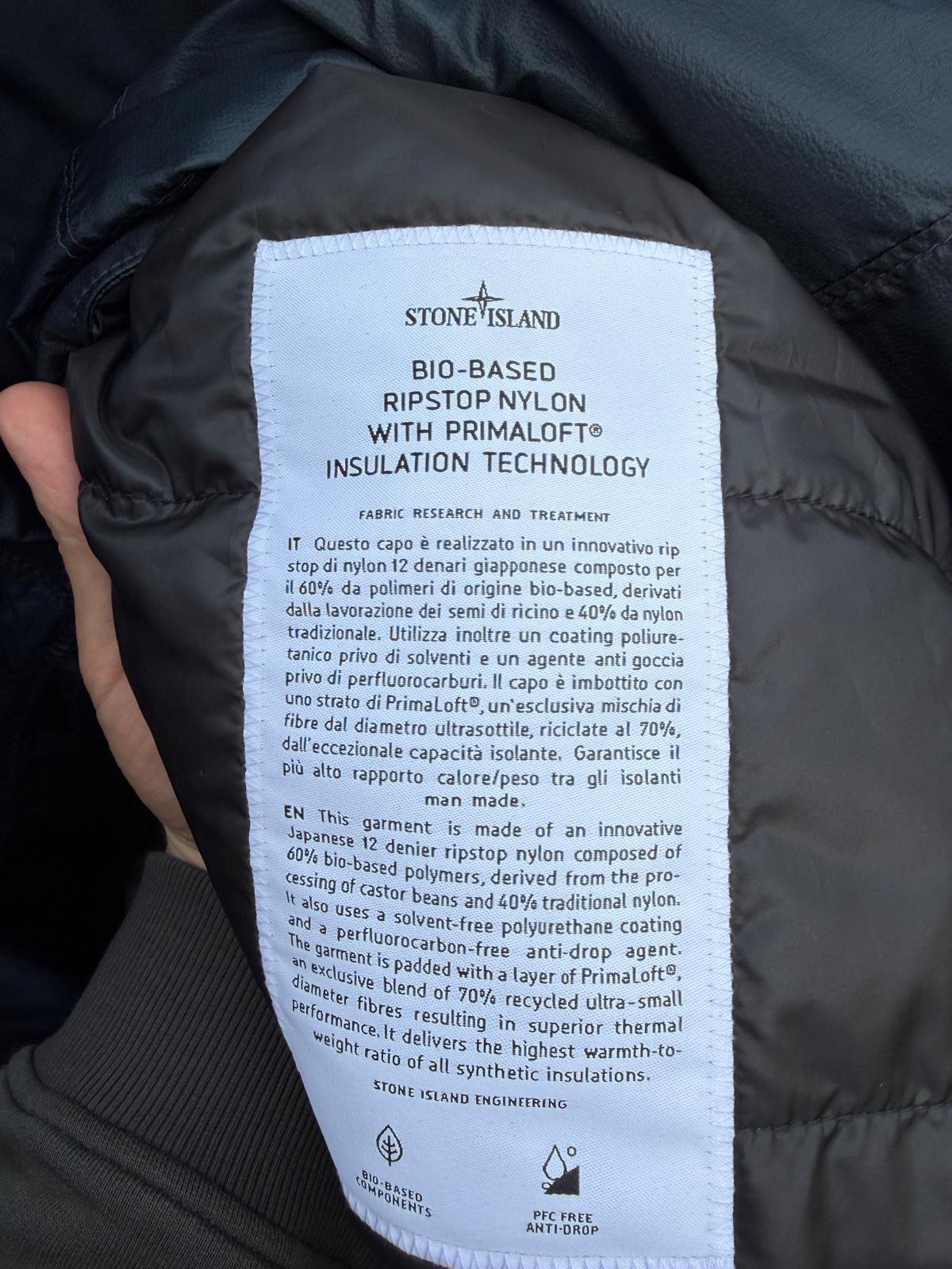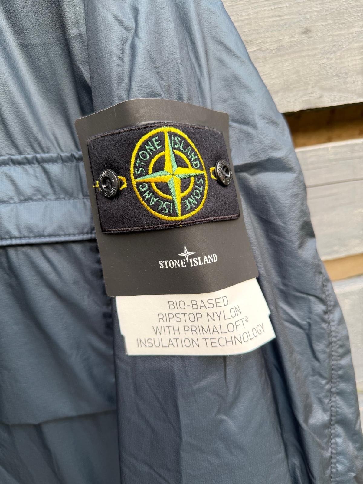 This Stone Island jacket combines high-performance insulation (PrimaLoft®) with a more sustainable outer fabric (bio-based nylon ripstop). It’s designed for cold or transitional weather, offering both warmth and a conscious material choice. According to one retailer: “Innovative Japanese 12 denier ripstop nylon composed of 60% bio-based polymers, derived from castor beans, and 40% traditional nylon. … Padded with PrimaLoft®