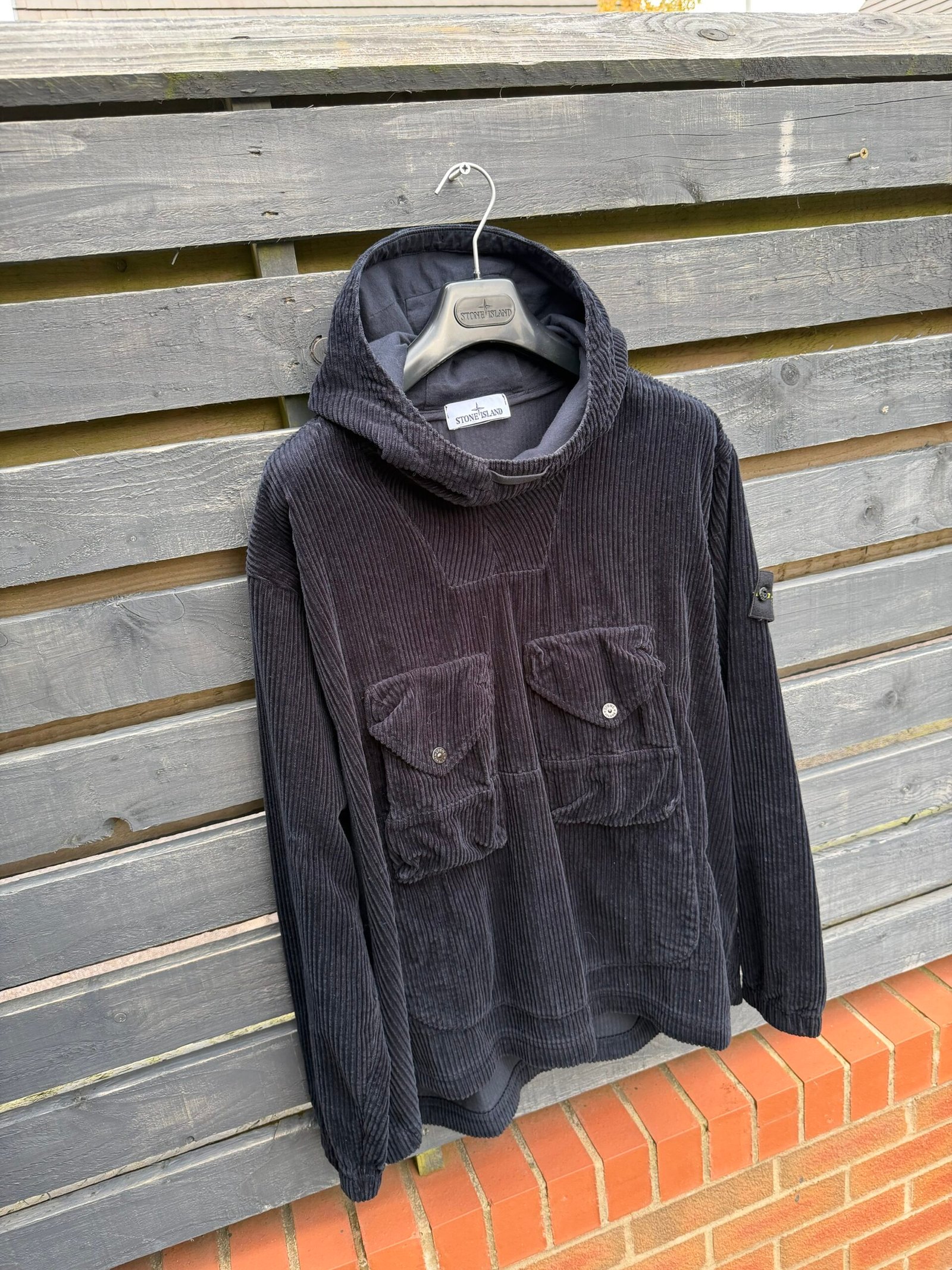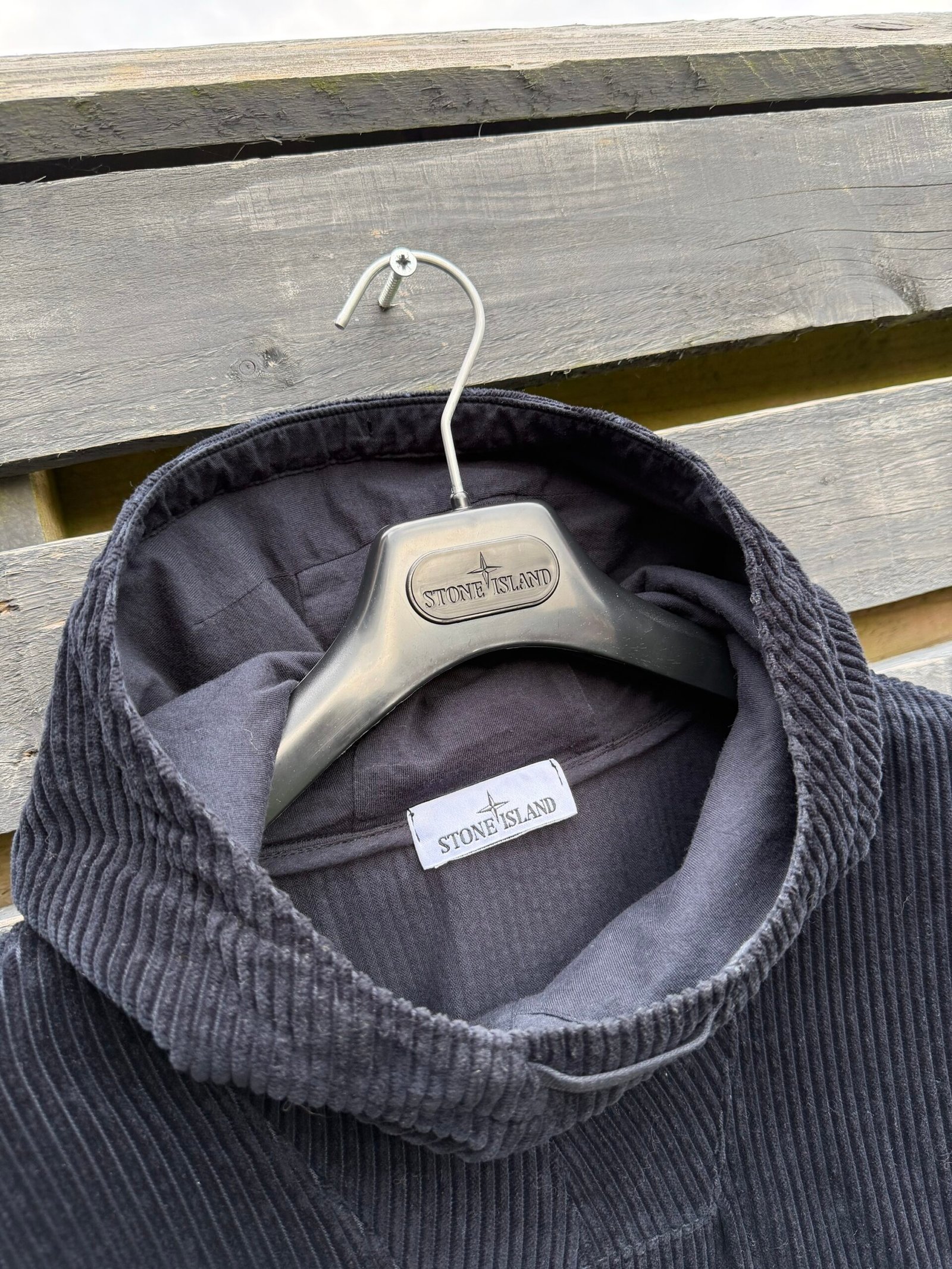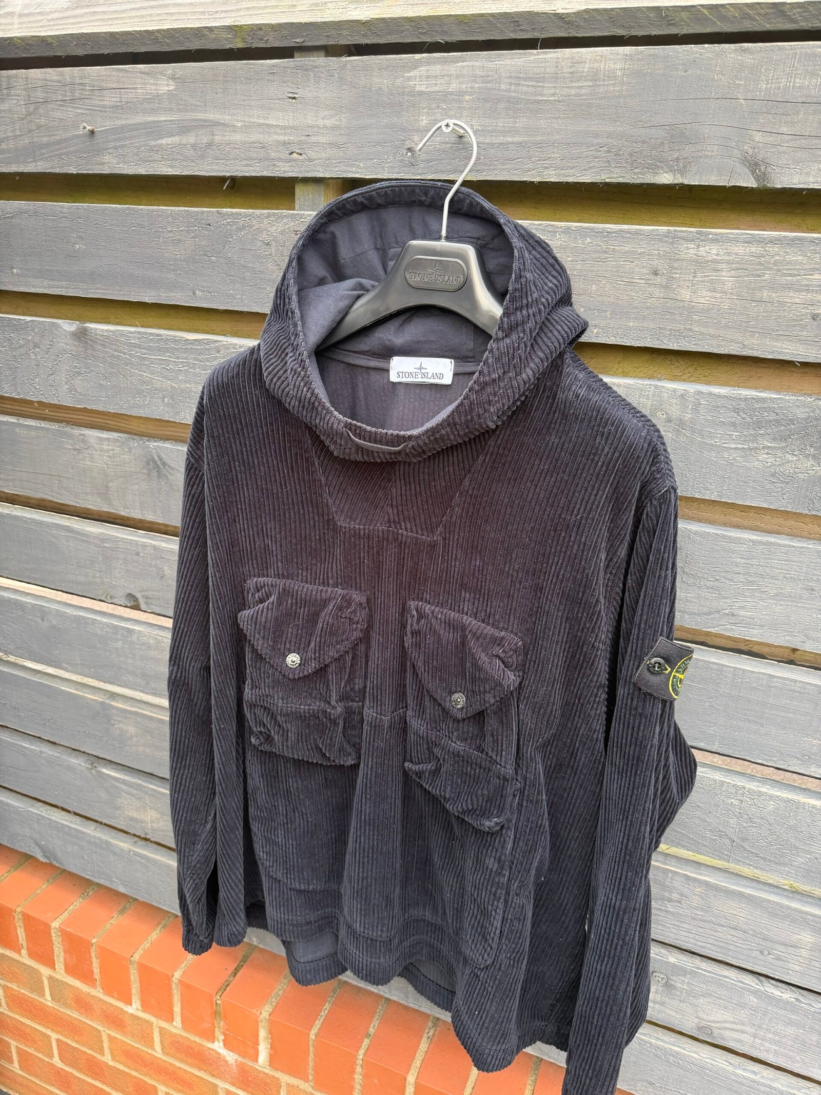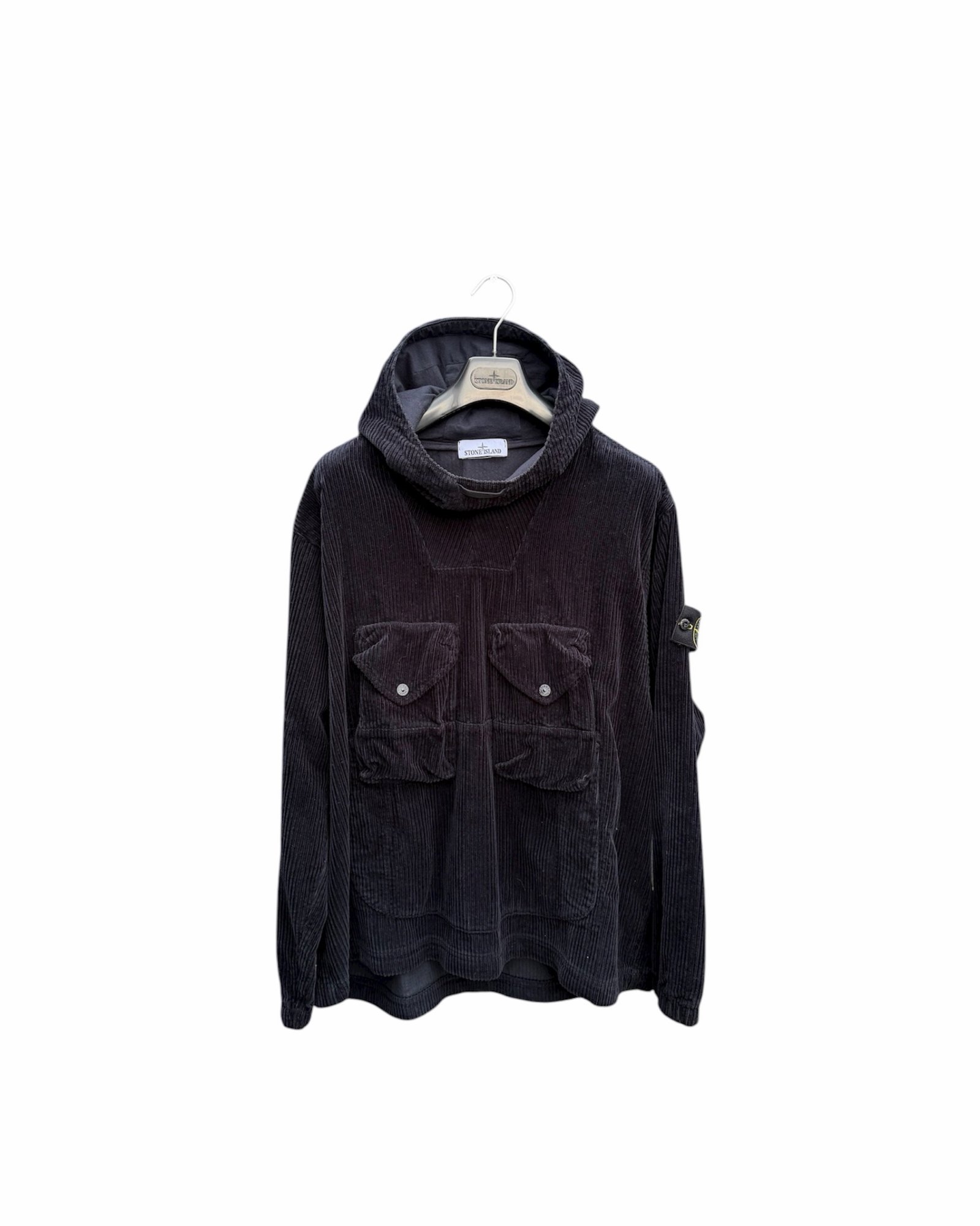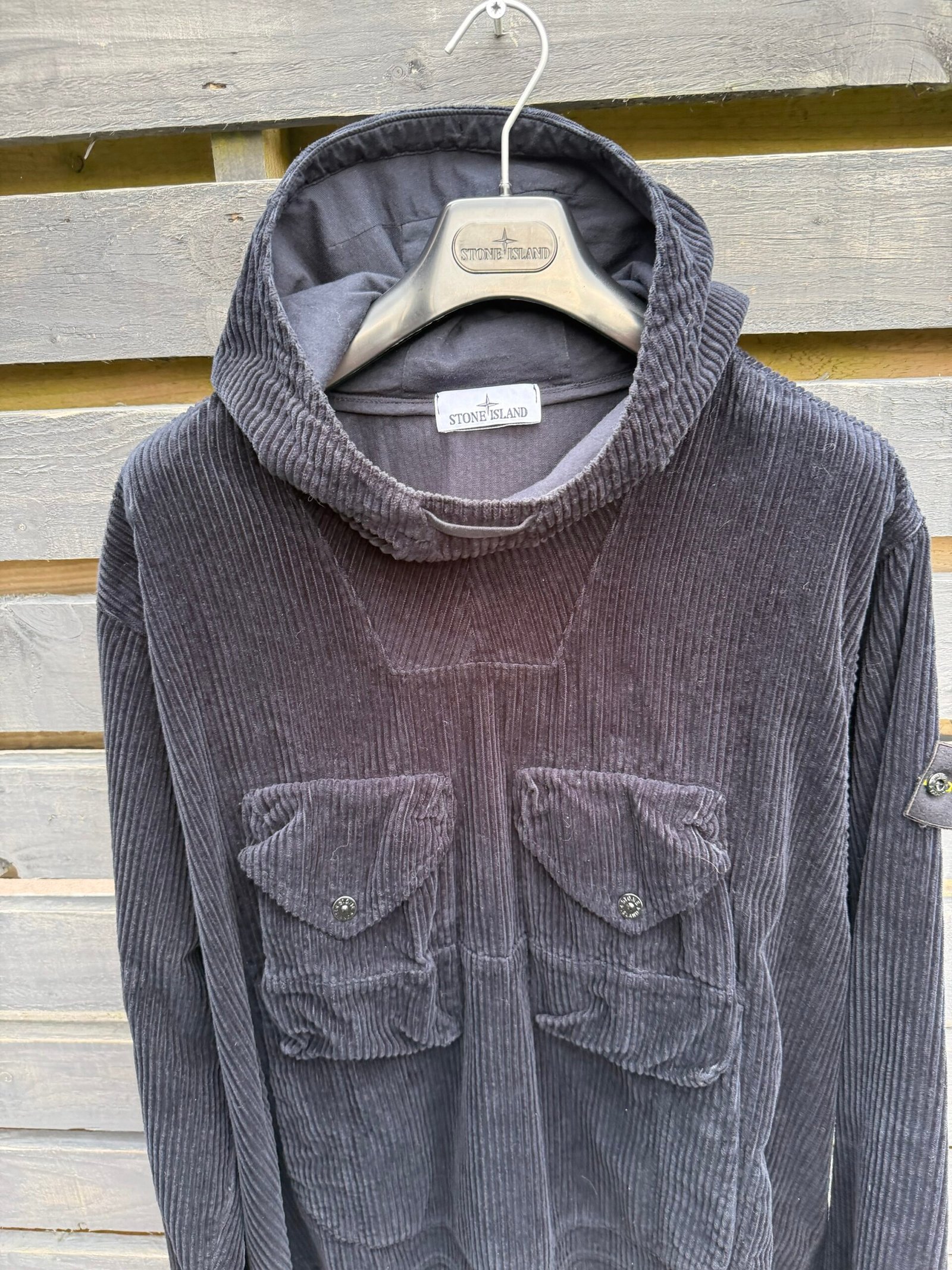 Stone Island Corduroy Smock – crafted from premium cotton corduroy with a garment-dyed finish for rich texture and depth. Features a half-zip design, adjustable hood, and front utility pocket, finished with the iconic compass badge for a timeless mix of workwear and terrace style.