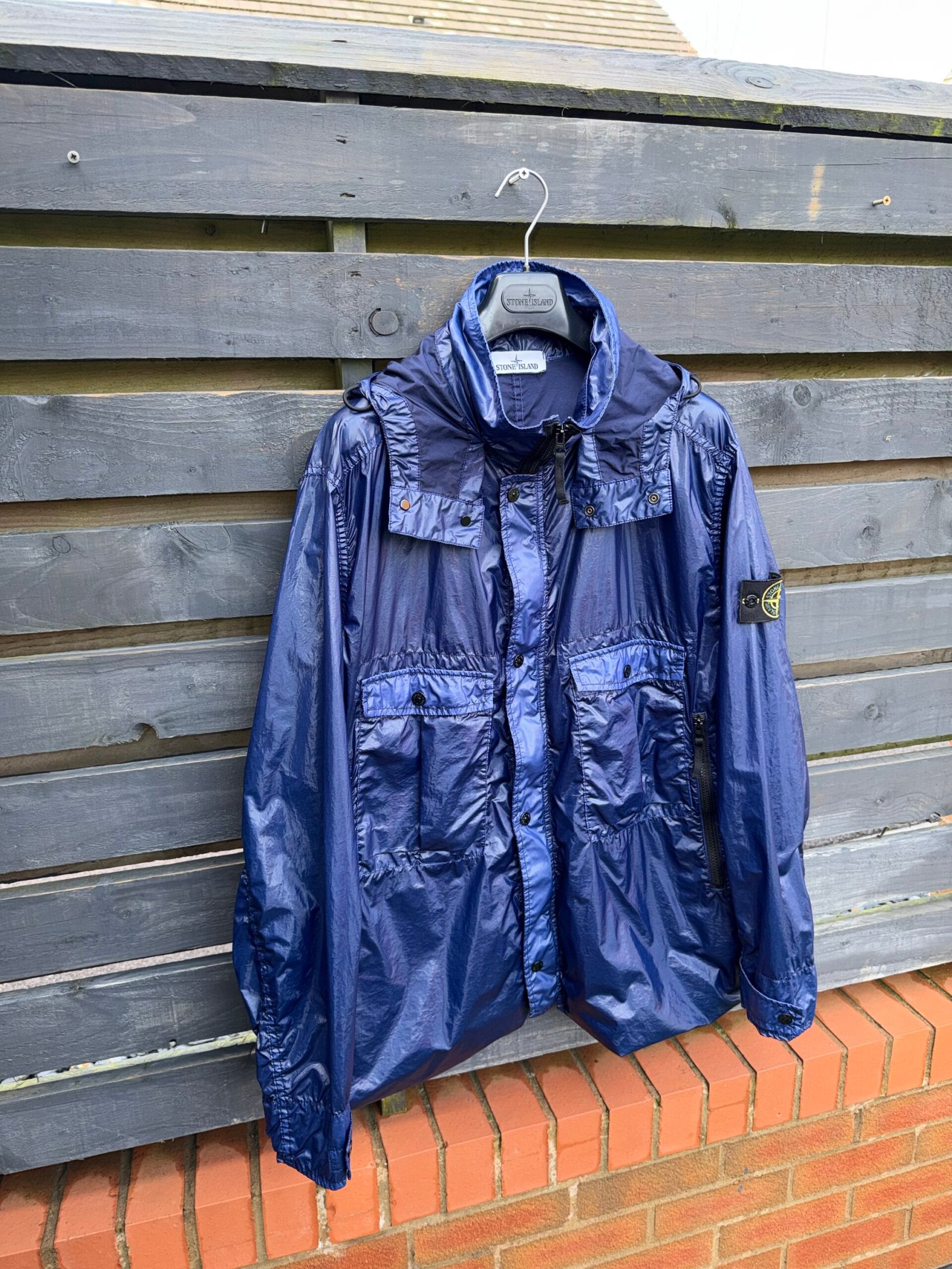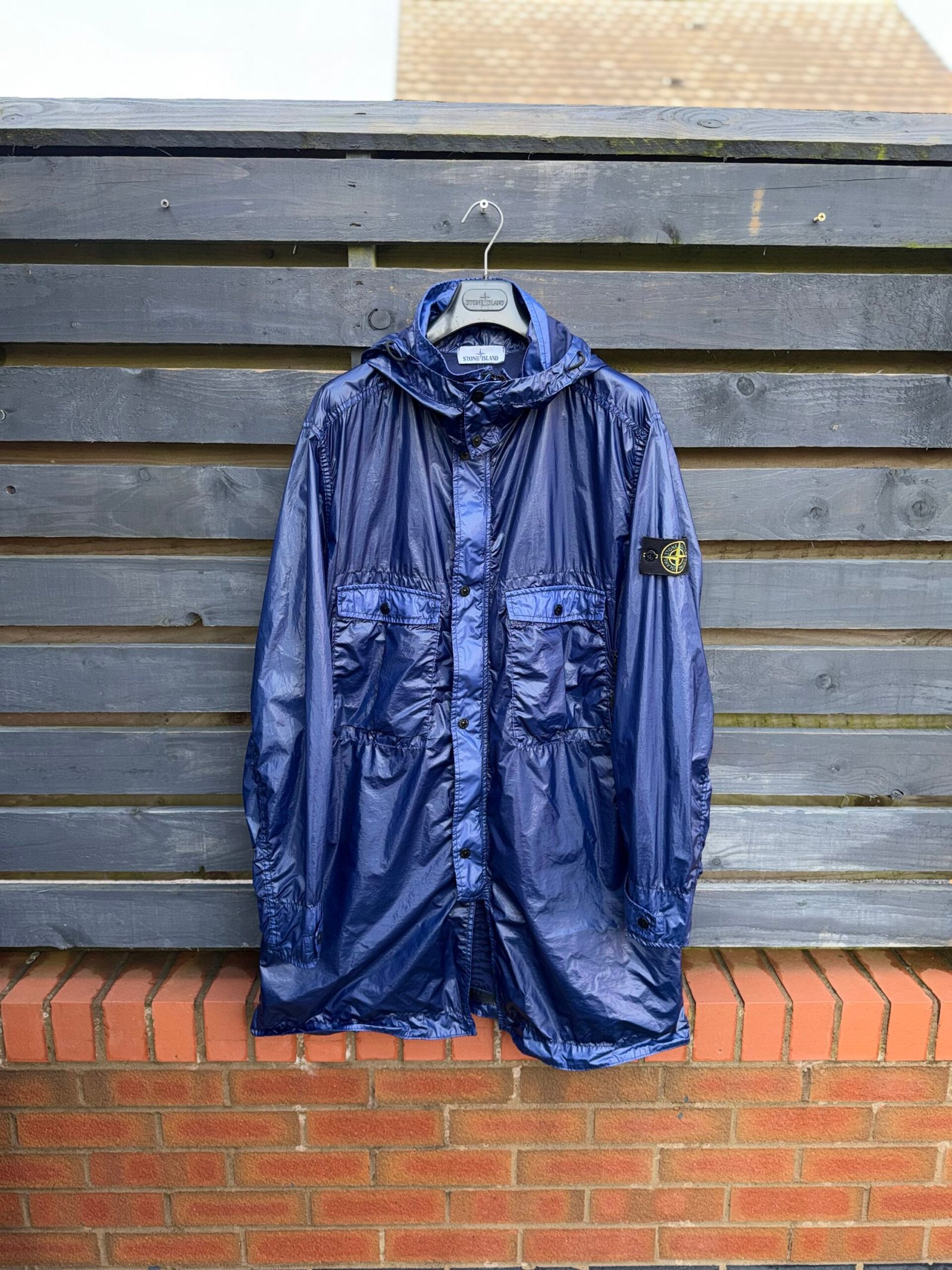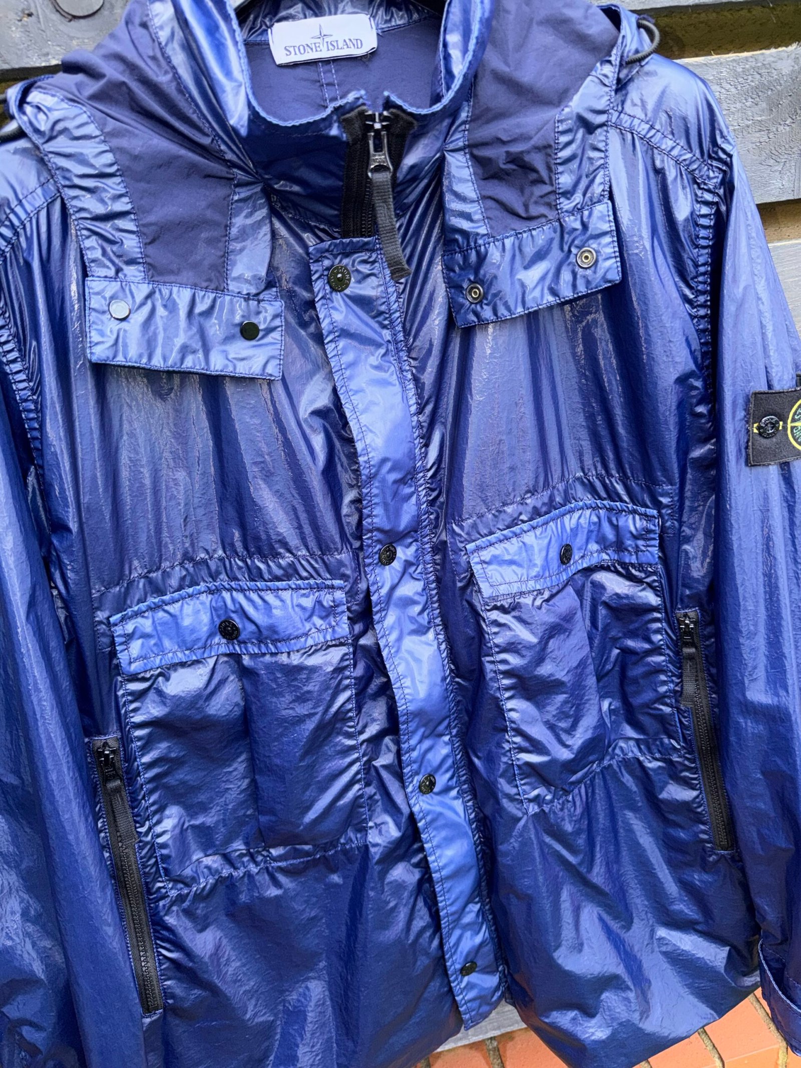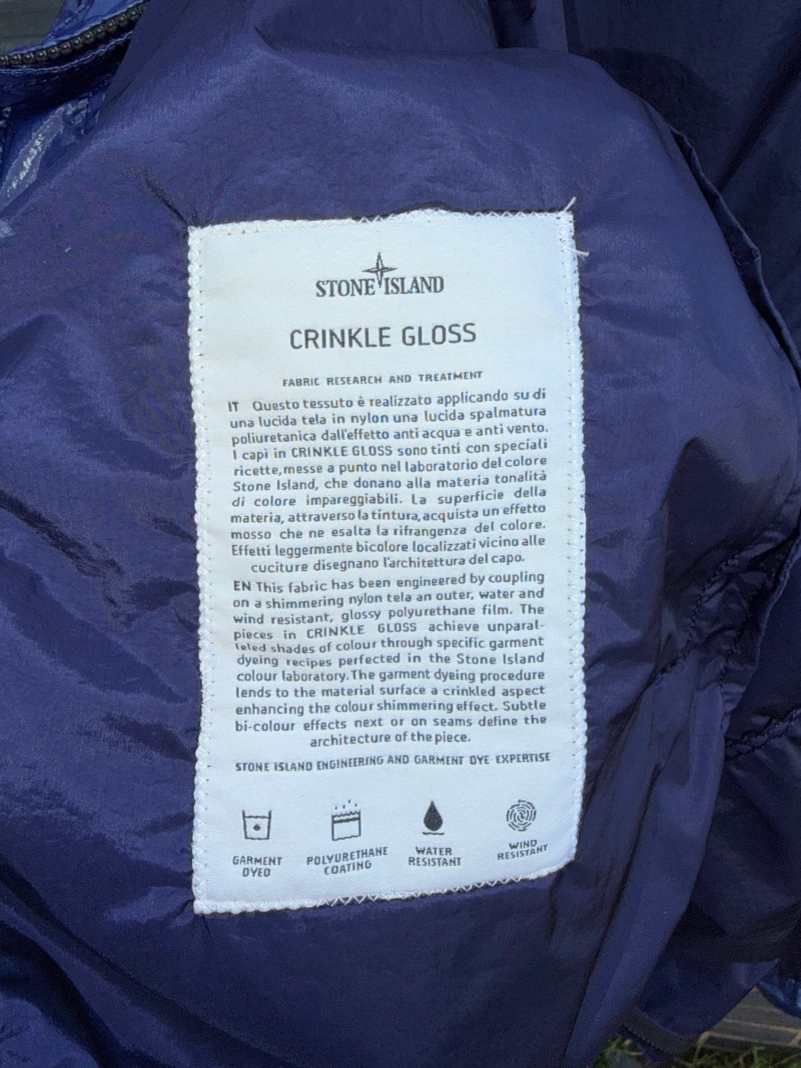 Stone Island Crinkle Gloss Parka Jacket in a distinctive, high-shine finish. Crafted from the brand’s signature crinkle gloss fabric, offering a lightweight yet durable feel with a unique textured look. Features a full zip and button fastening, adjustable hood, and functional pocket detailing for everyday wear. Finished with the iconic Stone Island badge on the sleeve, delivering a perfect balance of technical design and standout streetwear style. Very good condition. Please Note this item is pre-owned and may show minor signs of wear.