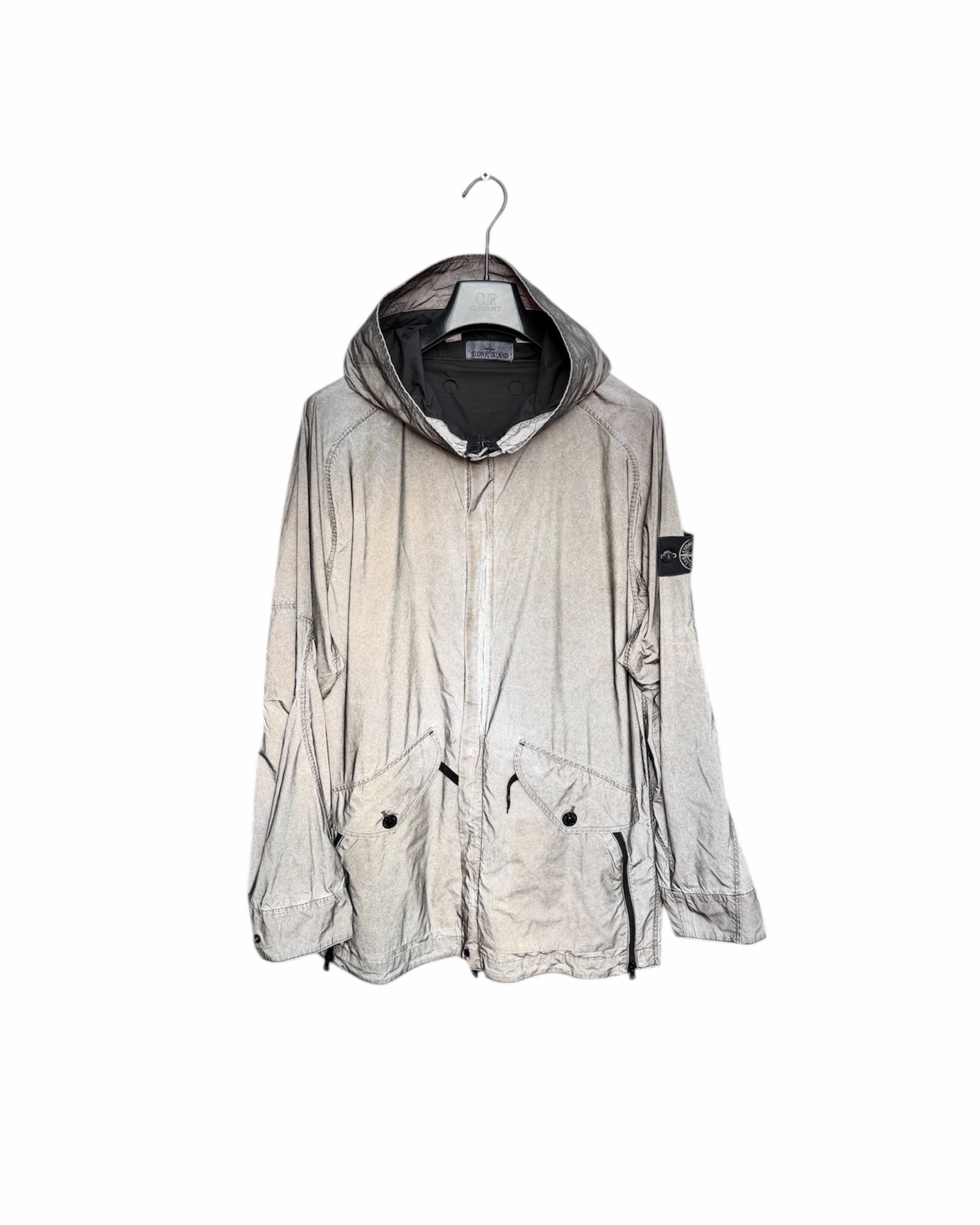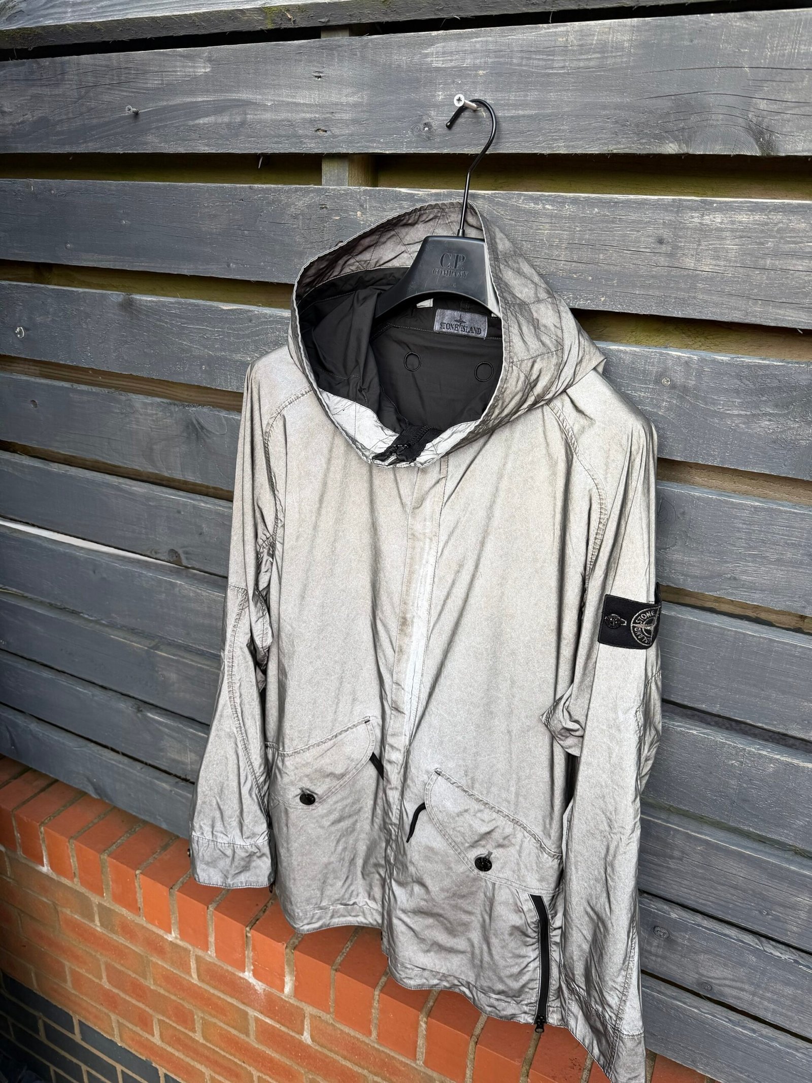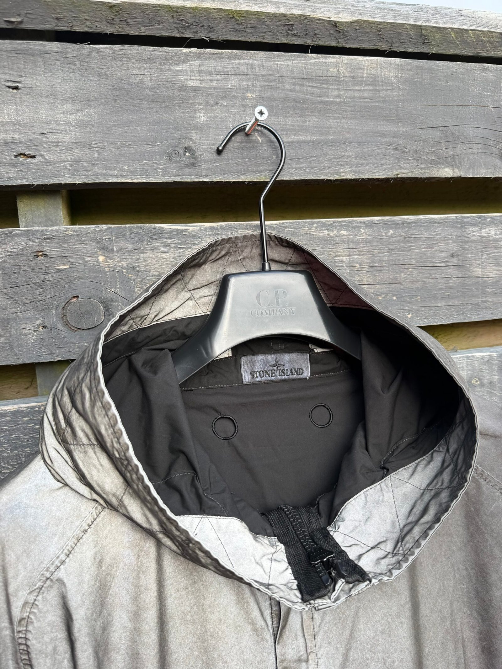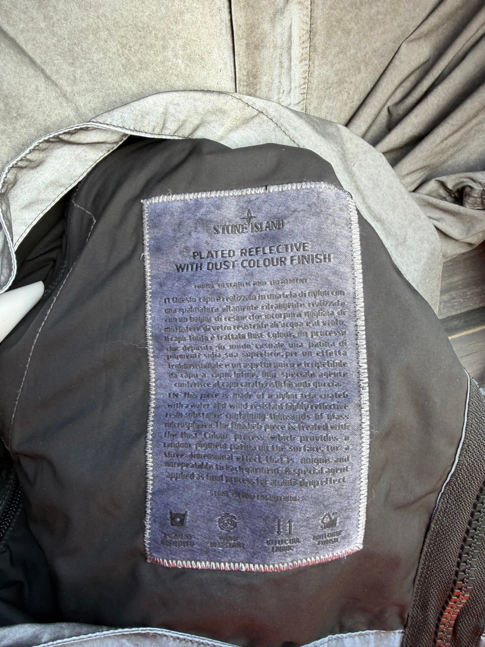 A true collector’s piece, the Stone Island Dust Plated Reflective Jacket features a reflective shell treated with a unique dust-coating process, giving it a textured, matte–metallic finish. Engineered to catch the light for a striking glow, it includes premium hardware, functional pocket detailing, and the iconic compass badge. A rare, head-turning example of SI’s cutting-edge textile innovation. Very good condition.