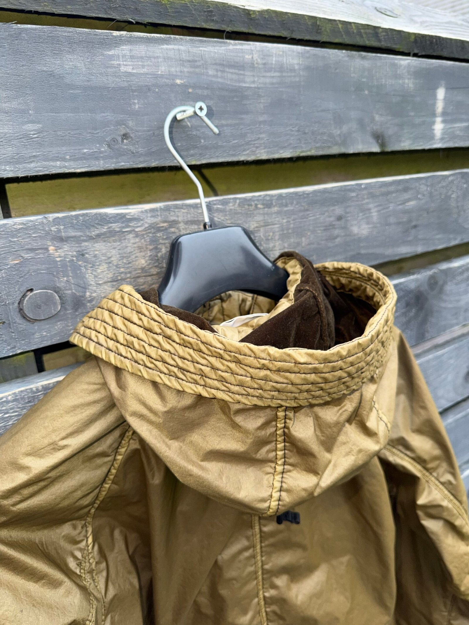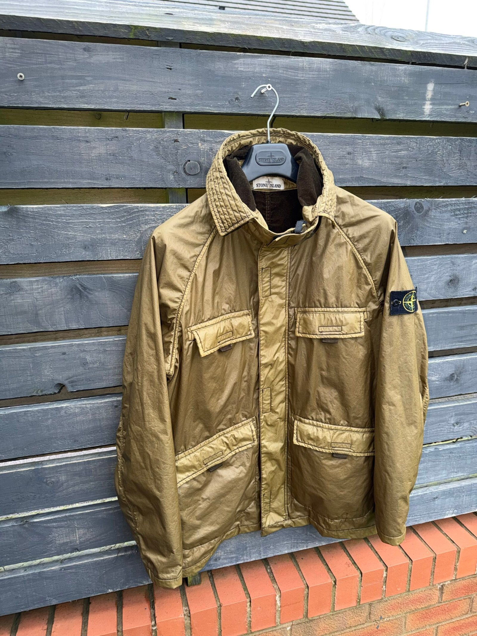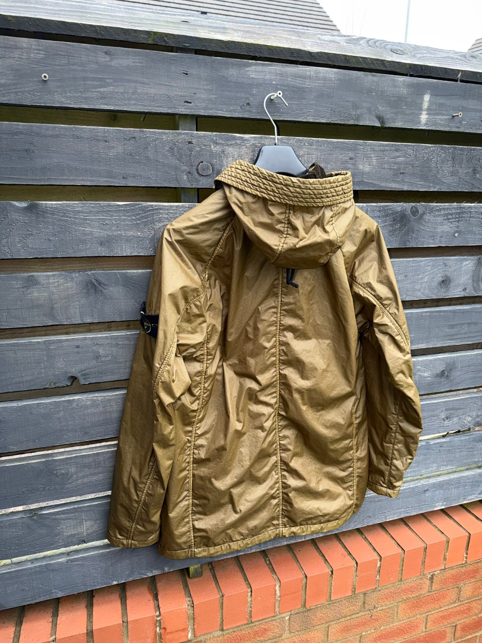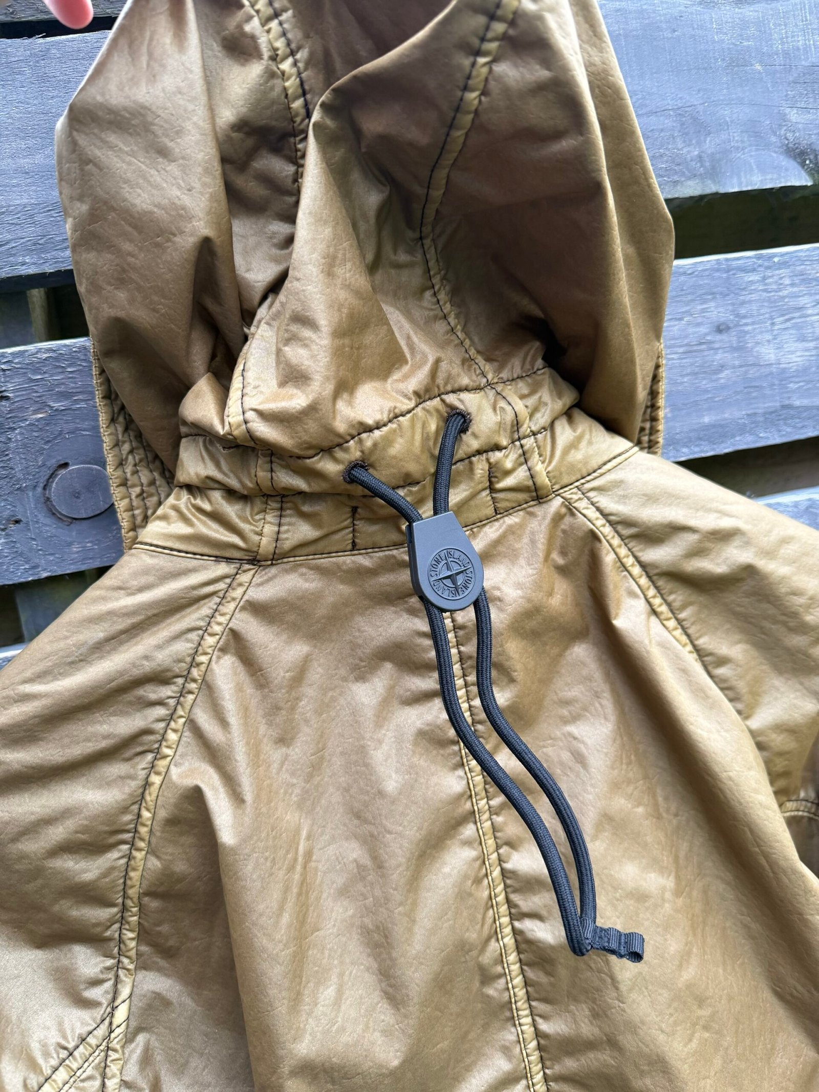 A technical, utility‑inspired outer layer crafted from hyper‑lightweight Lamy nylon, bonded to a flocked interior for a subtle textured feel. Garment‑dyed with an anti‑drop finish, it features multiple front pockets, a full zip closure with 2‑way zip, an adjustable hood, and the signature removable Stone Island Compass patch. Practical yet understated, it blends functional design with the brand’s signature experimental fabric technology. Very good condition. Note this item is pre-owned and may show minor signs of wear.