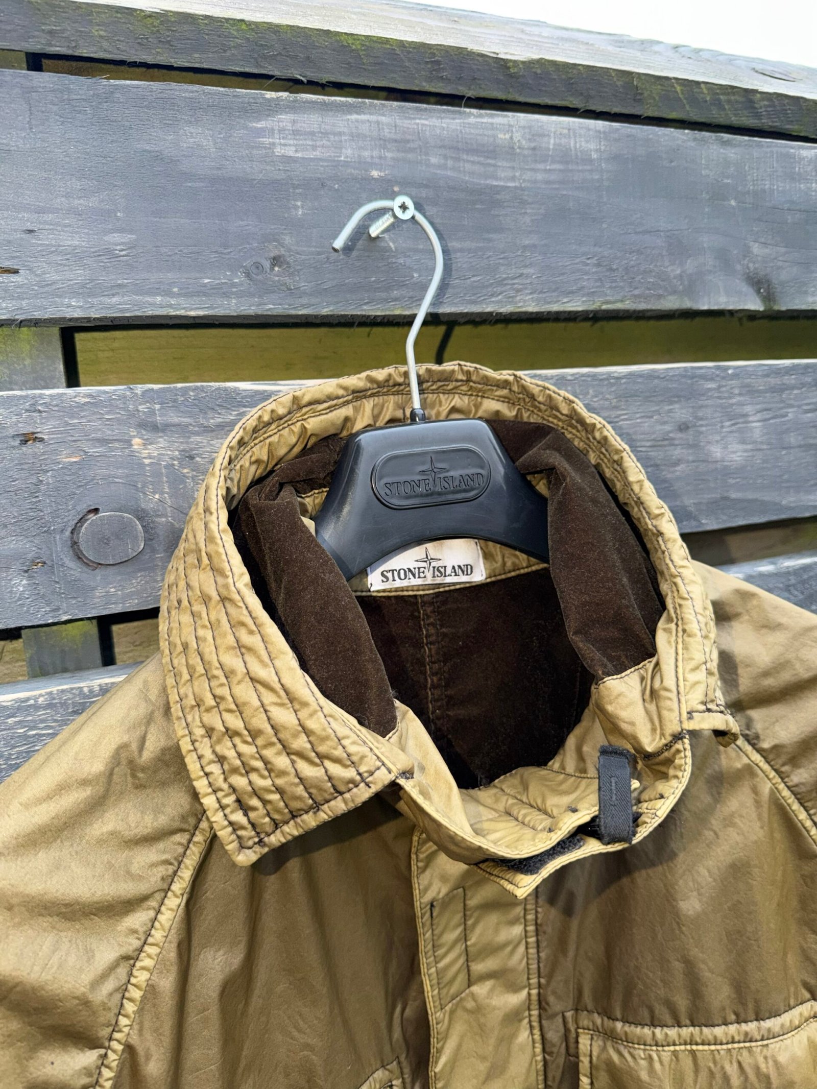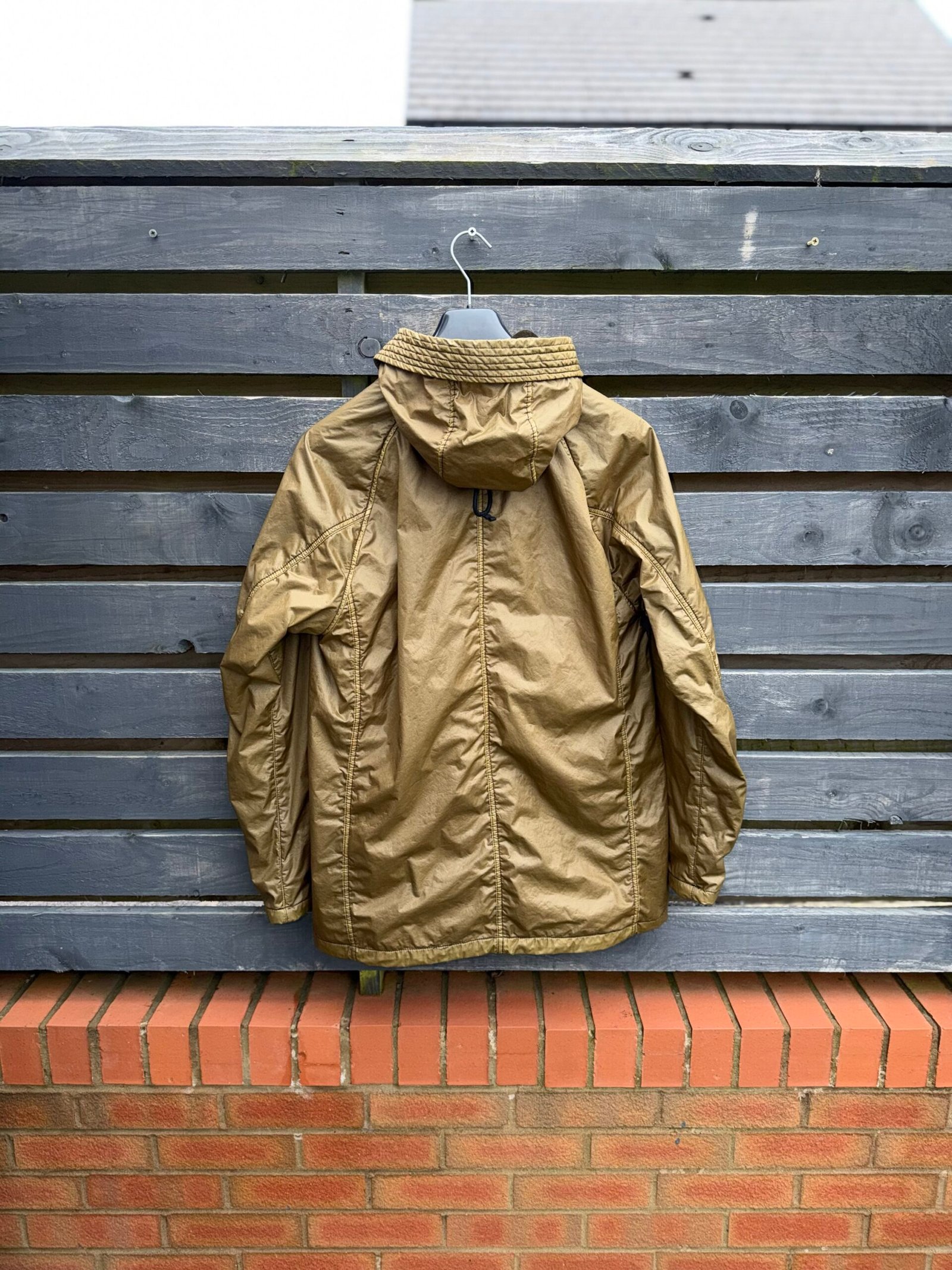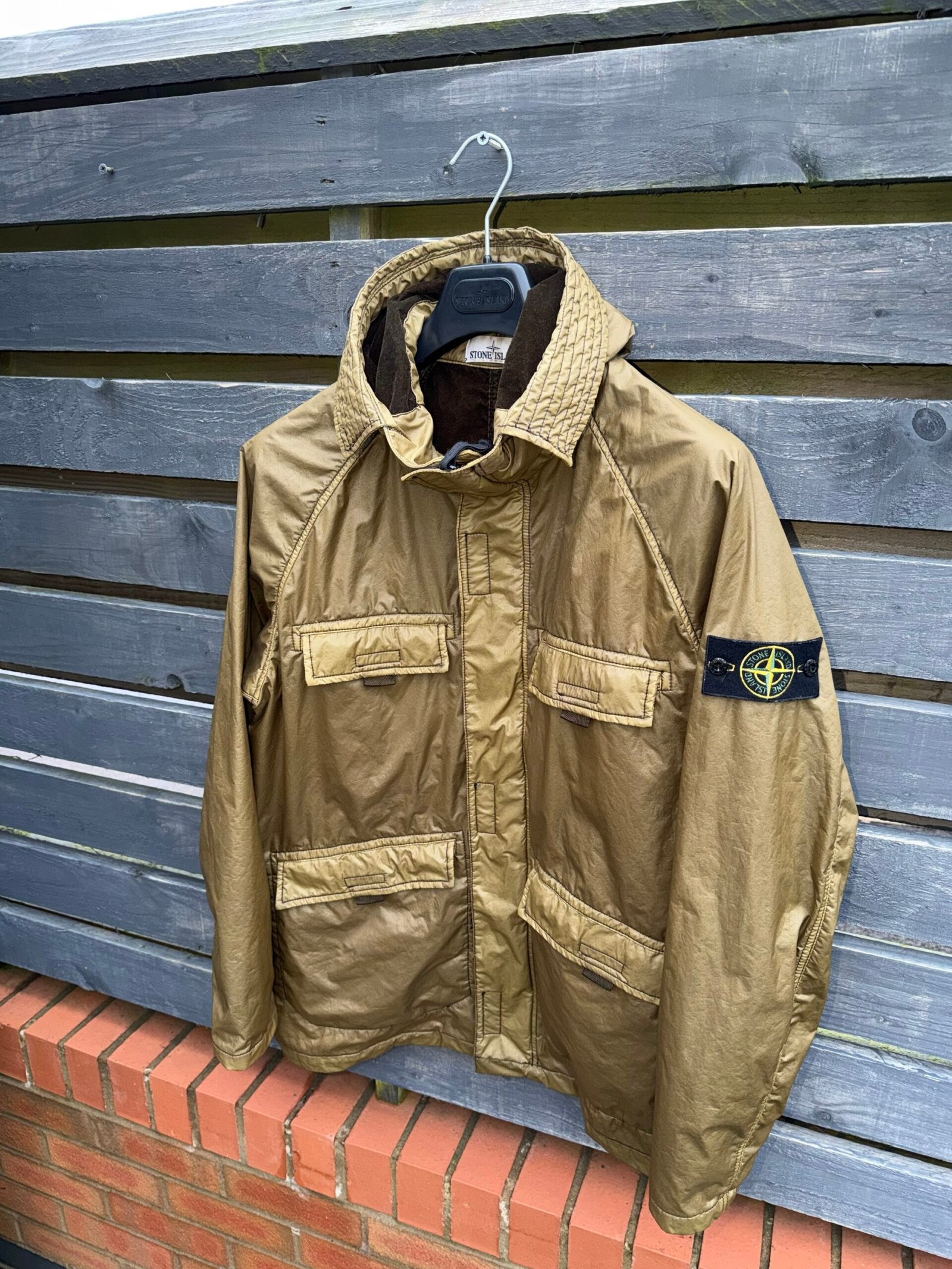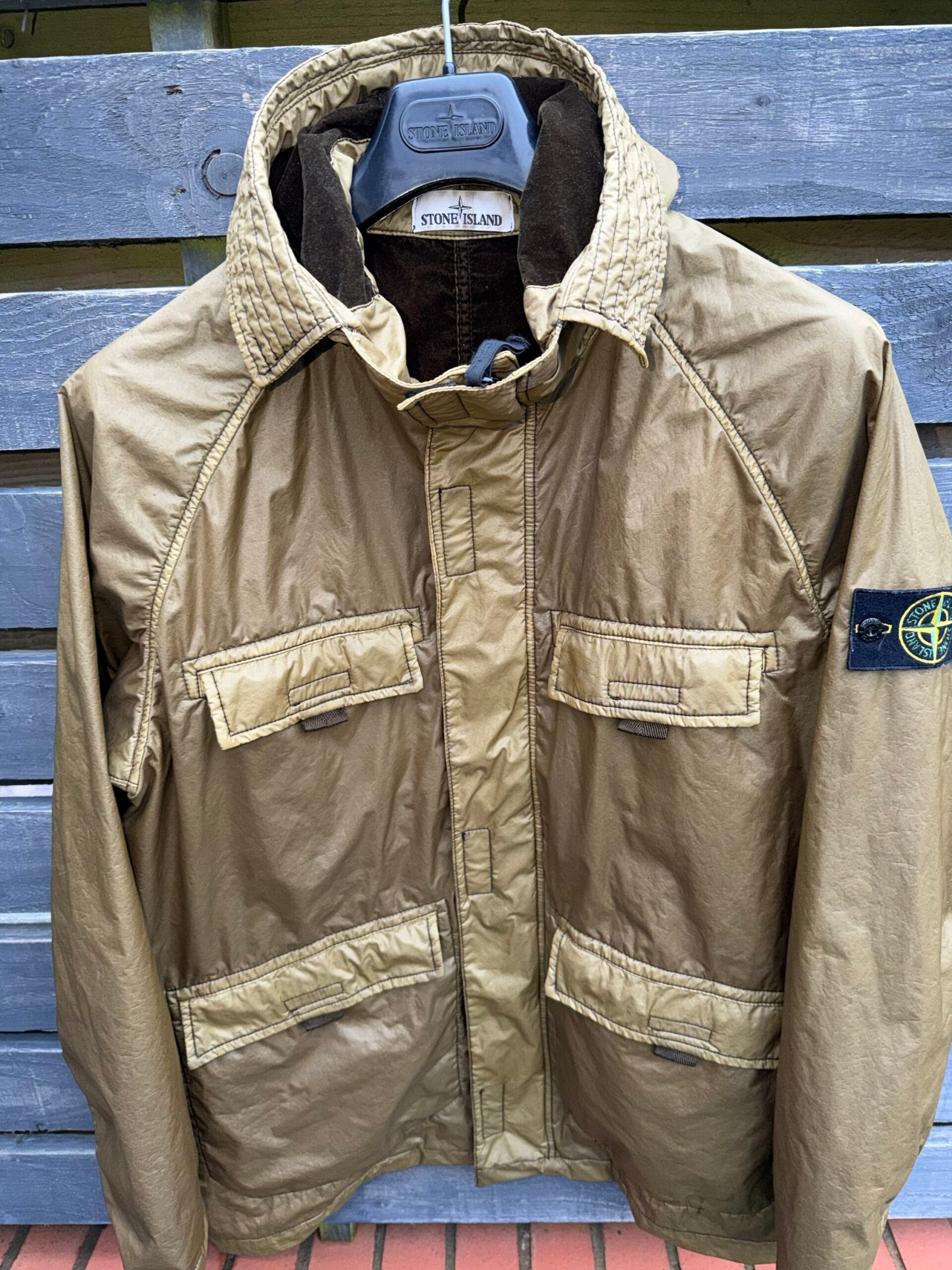 A technical, utility‑inspired outer layer crafted from hyper‑lightweight Lamy nylon, bonded to a flocked interior for a subtle textured feel. Garment‑dyed with an anti‑drop finish, it features multiple front pockets, a full zip closure with 2‑way zip, an adjustable hood, and the signature removable Stone Island Compass patch. Practical yet understated, it blends functional design with the brand’s signature experimental fabric technology. Very good condition. Note this item is pre-owned and may show minor signs of wear.