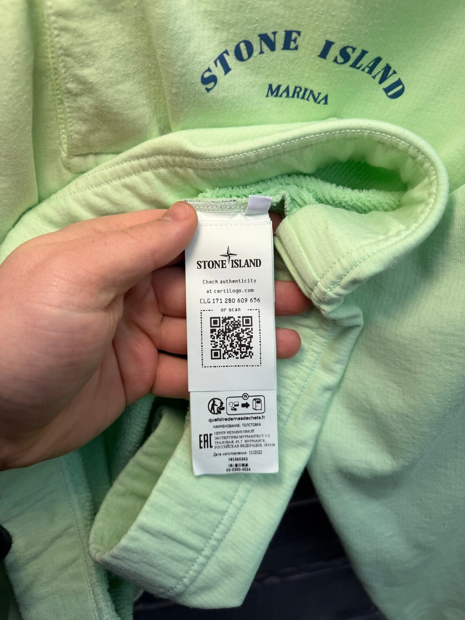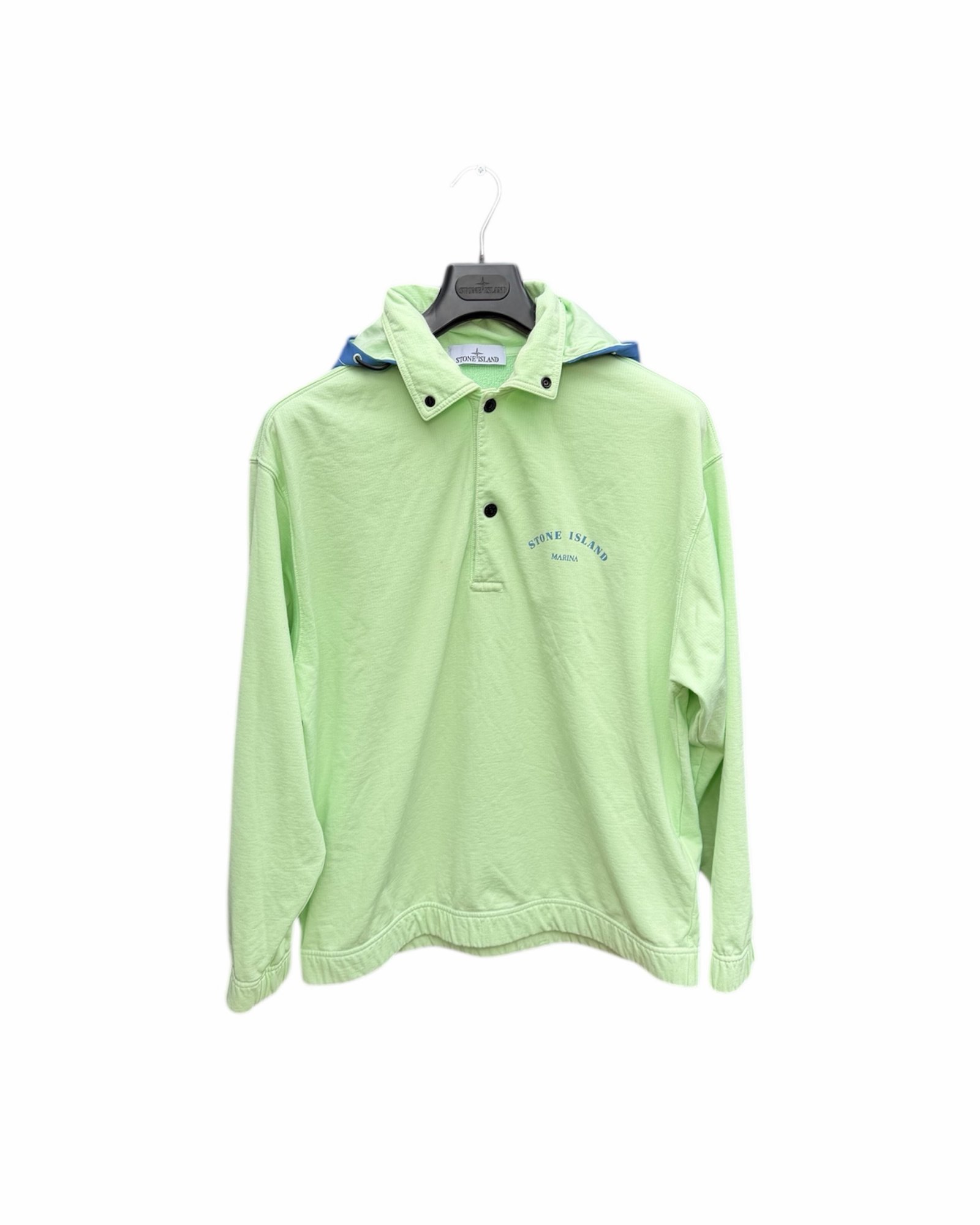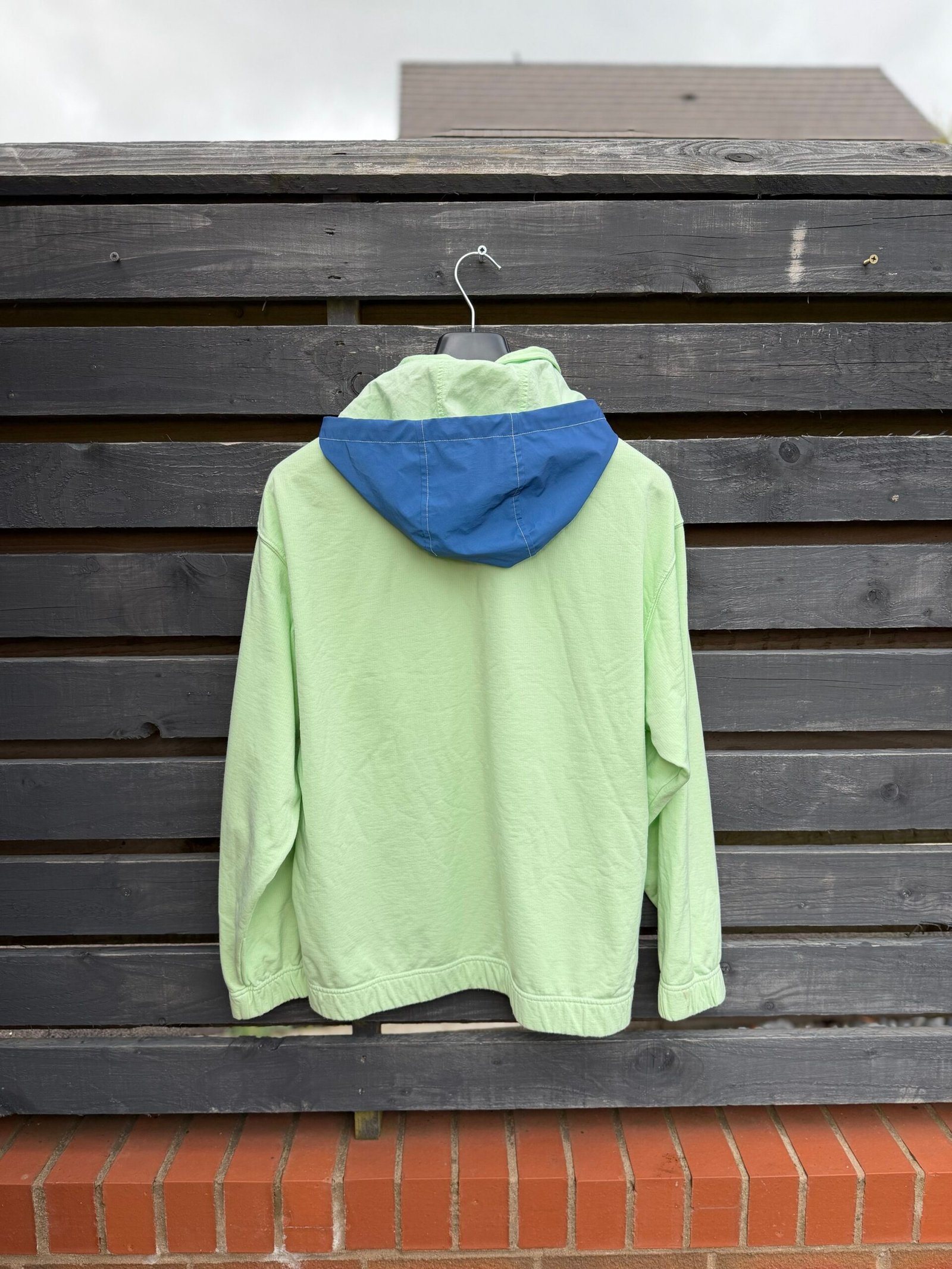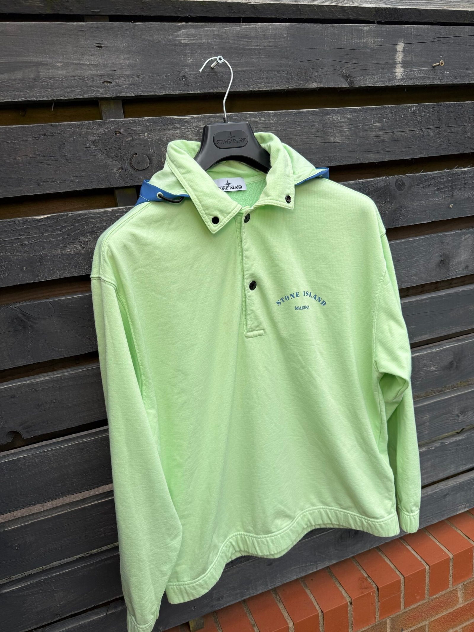 A rare piece from the Stone Island Marina line, this lightweight pullover comes in a soft pastel green with a contrasting blue hood detail. Features a half-button placket, subtle “Stone Island Marina” chest print, and elasticated hem and cuffs for a relaxed fit. Premium casualwear that mixes comfort with that signature Stone Island edge. Worn, good condition.