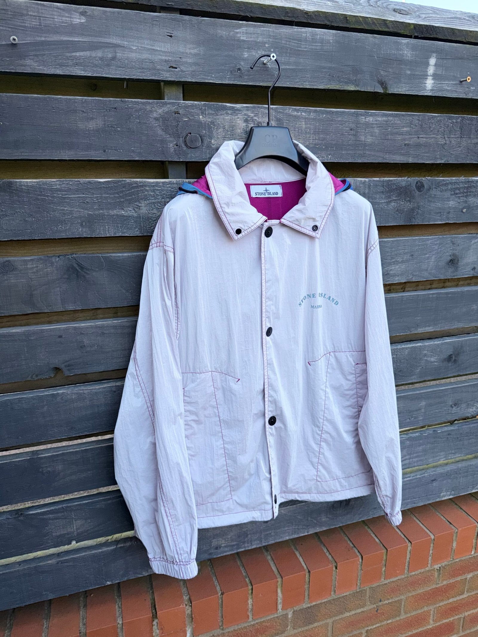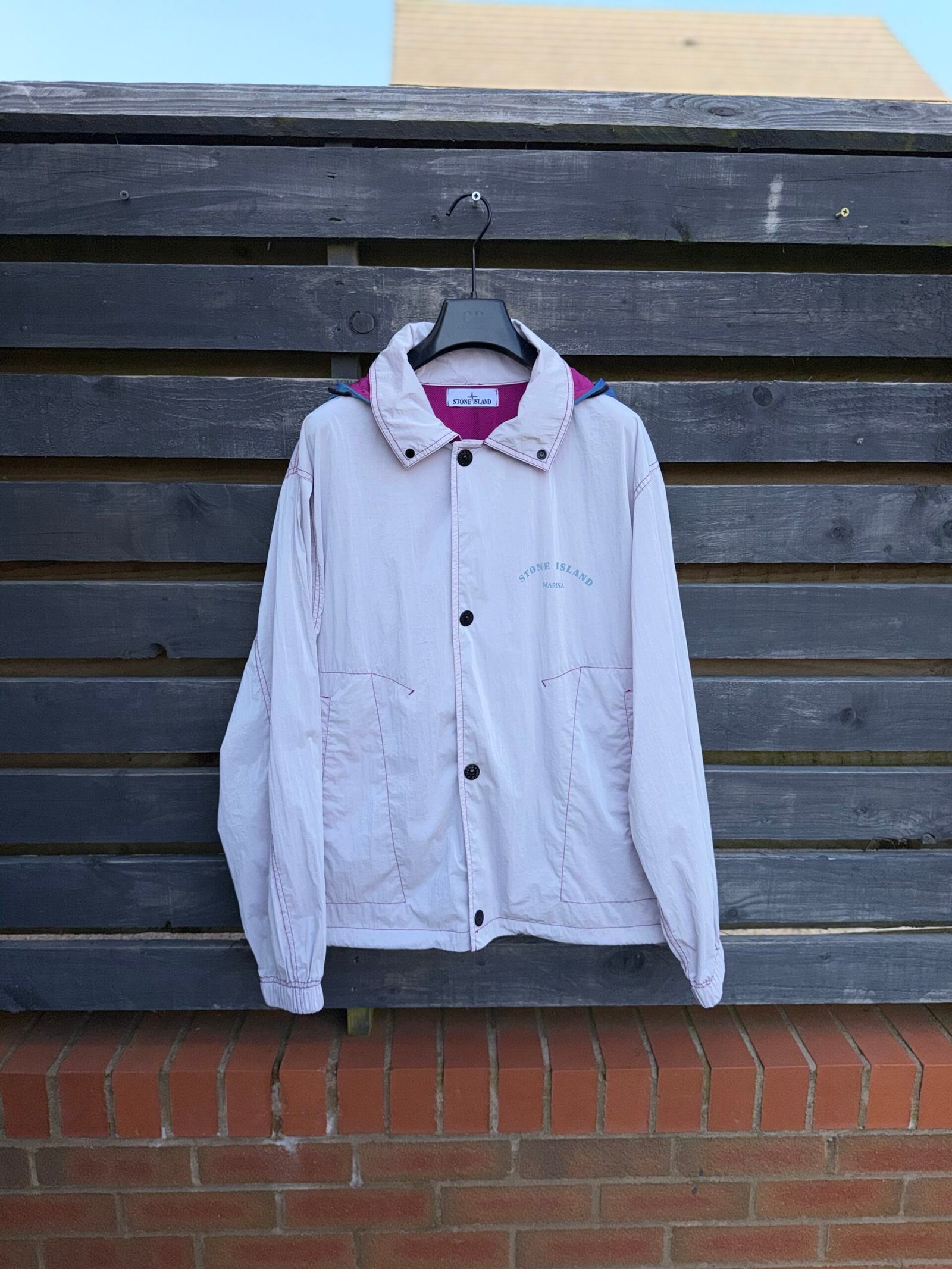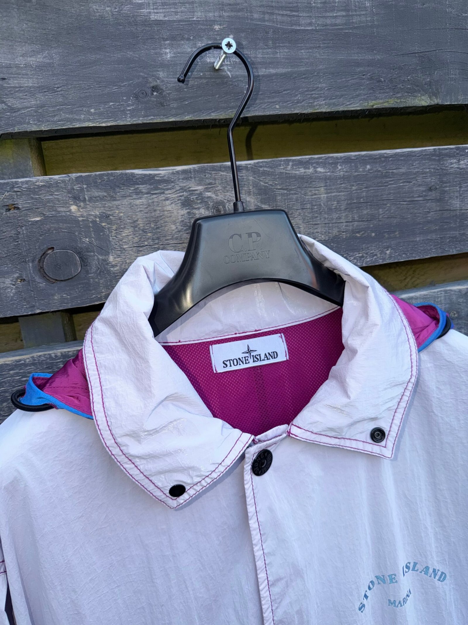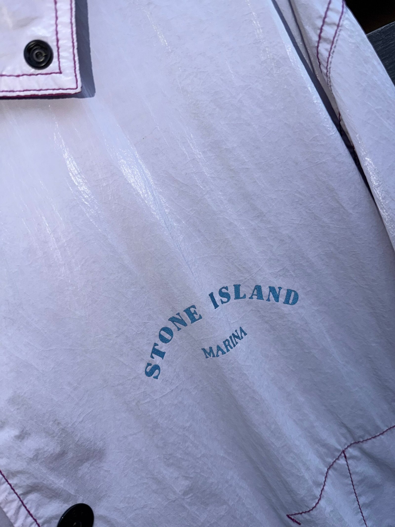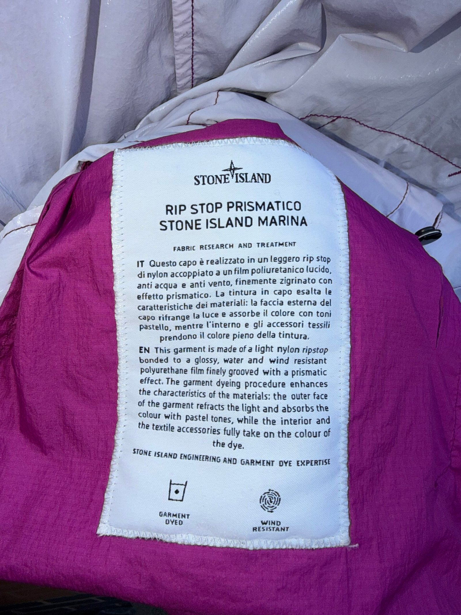 The Stone Island Marina Ripstop Prismatico Jacket is a technical outerwear piece that blends maritime-inspired design with advanced fabric innovation. Crafted from durable ripstop fabric, it offers lightweight protection and resistance to wear while maintaining a structured silhouette. The Prismatico treatment gives the surface a subtle iridescent, light-reactive finish that shifts in tone depending on movement and lighting. Finished with functional detailing, secure fastening, and understated branding, it delivers a modern, performance-driven aesthetic with a distinctive visual edge. Very good condition. Please Note this item is pre-owned and may show minor signs of wear