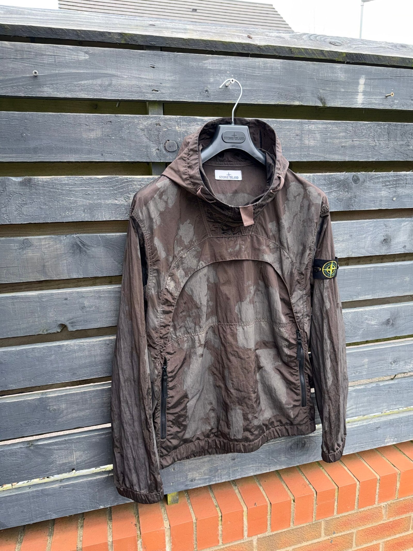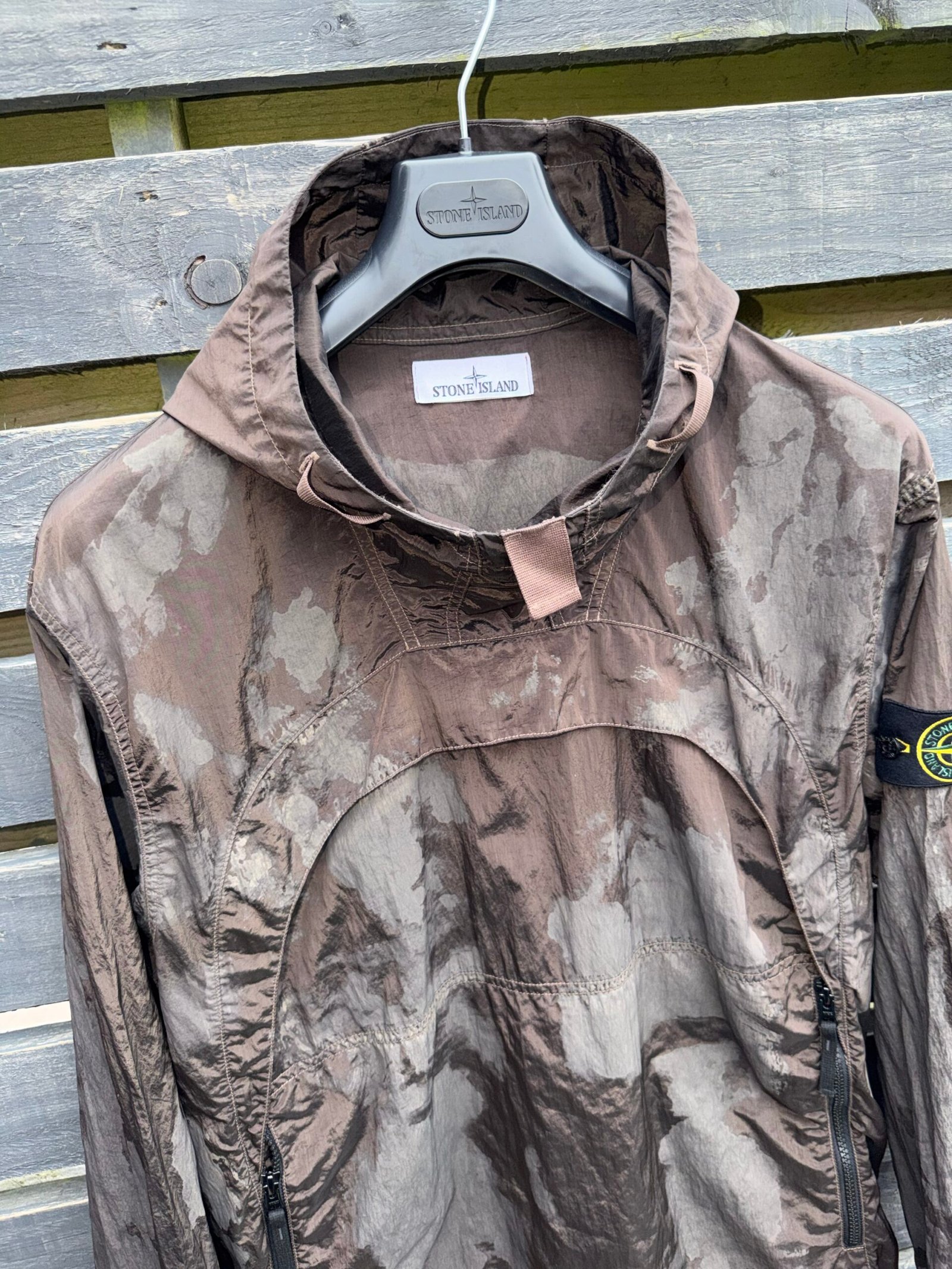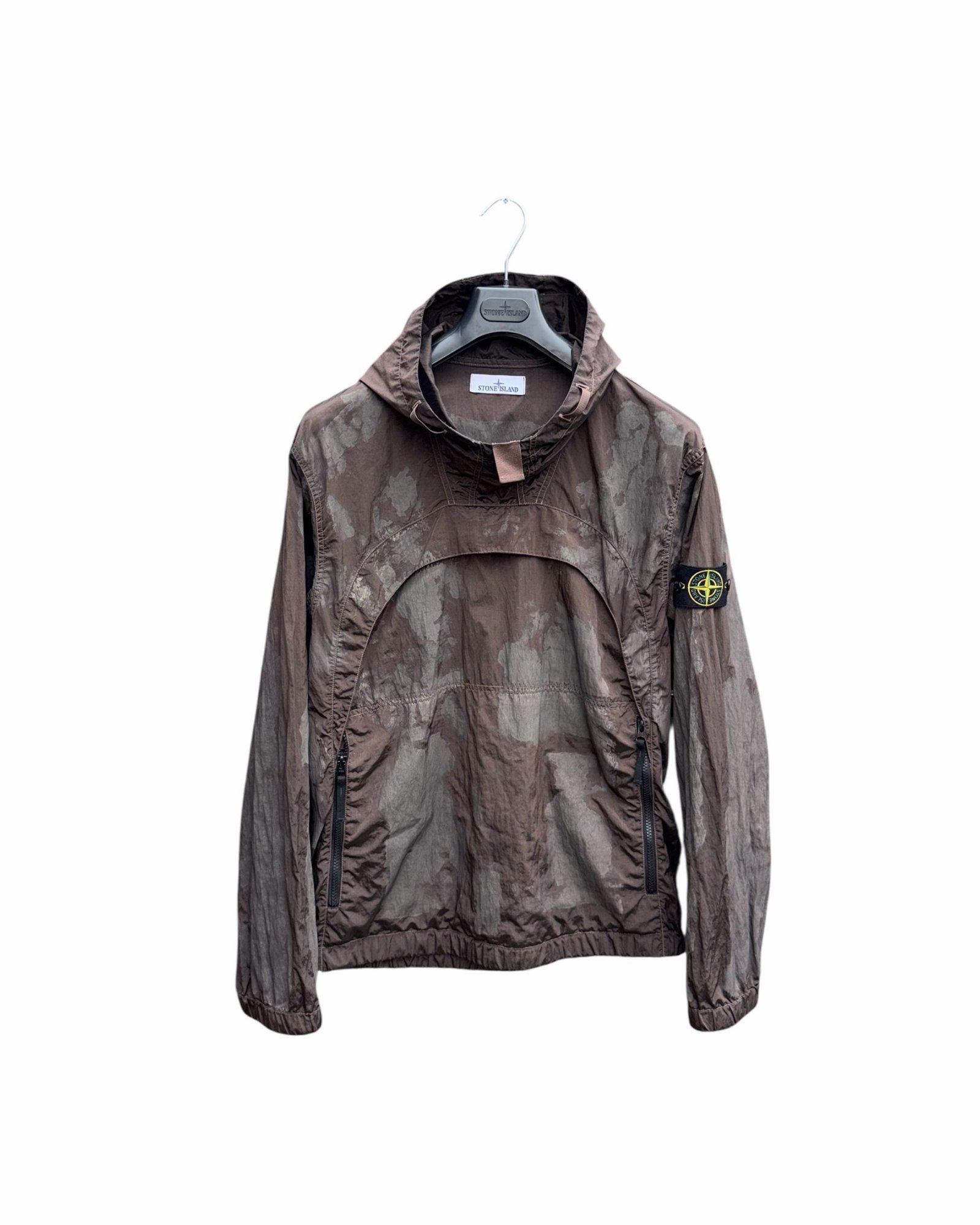 A standout technical piece from Stone Island, this Nylon Metal Camo Printed Smock combines innovative fabric with the brand’s signature military-inspired aesthetic. Crafted from Stone Island’s iconic Nylon Metal material, the smock features a unique metallic sheen with an all-over camouflage print that shifts subtly in different light. Designed with a lightweight yet durable construction, it includes a functional half-zip front, adjustable hood, and the unmistakable Stone Island compass badge on the sleeve. A perfect blend of performance and street-ready style. Very good condition. Please Note this item is pre-owned and may show minor signs of wear.