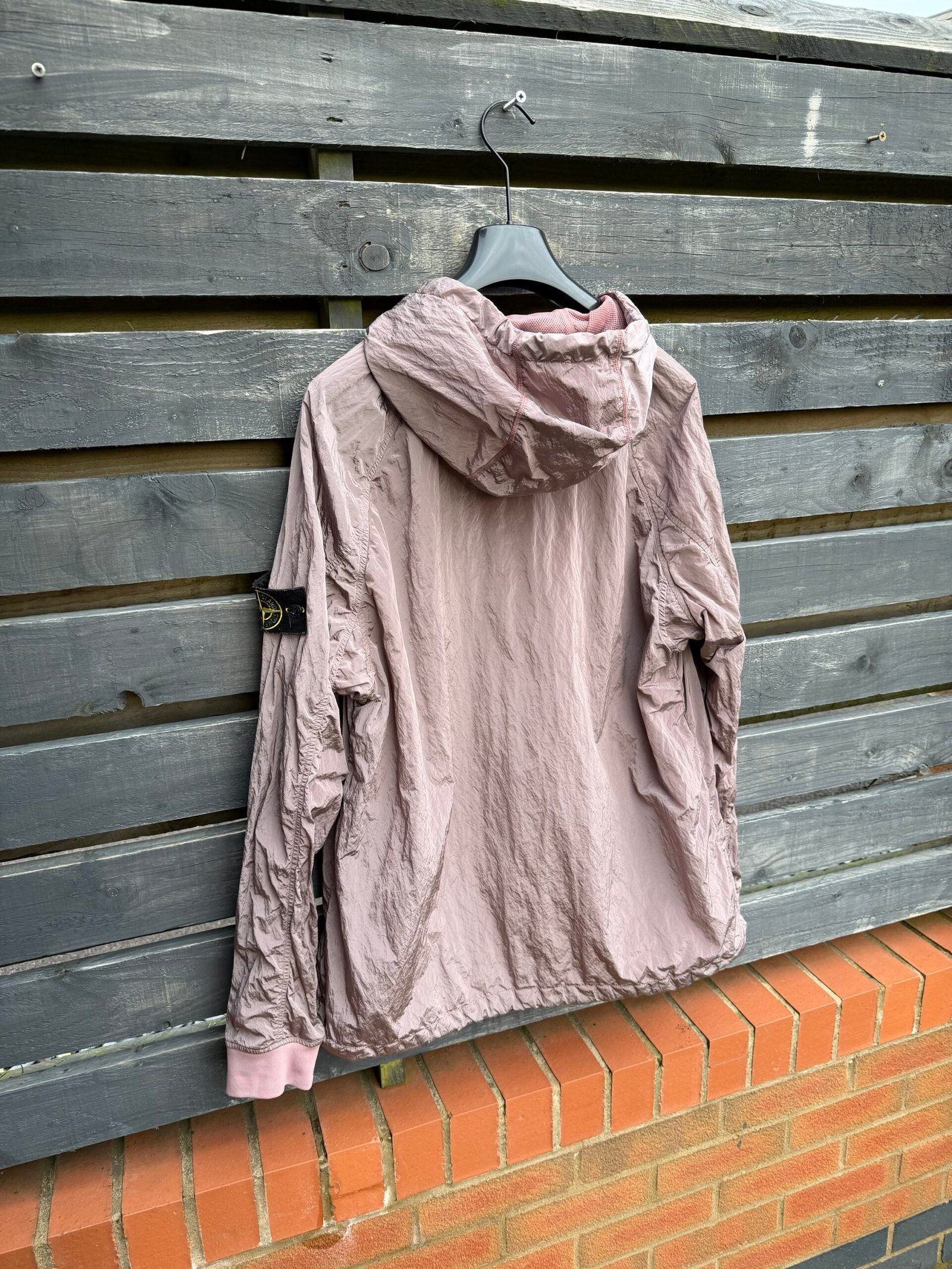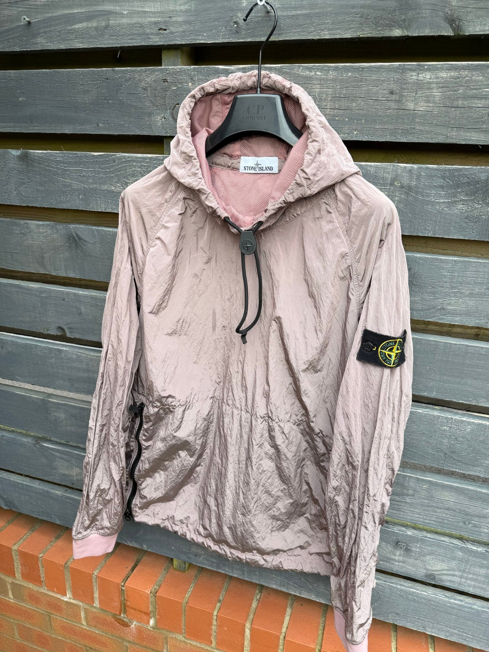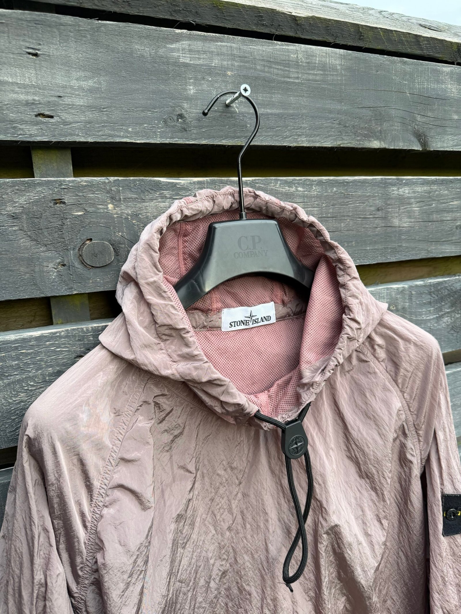A standout lightweight smock from Stone Island crafted in their signature Nylon Metal fabric — giving a metallic, slightly iridescent surface that catches light with a subtle shine. It features a drawstring hood, raglan sleeves, a zip‑front pouch pocket, ribbed cuffs and mesh lining, plus the detachable Stone Island badge at the sleeve. Wind‑ and water‑resistant with an anti‑drop finish, this smock blends technical utility and streetwear attitude — perfect as a layering piece or transitional outerwear. Very good condition, water mark on the front can’t be seen in the light.
