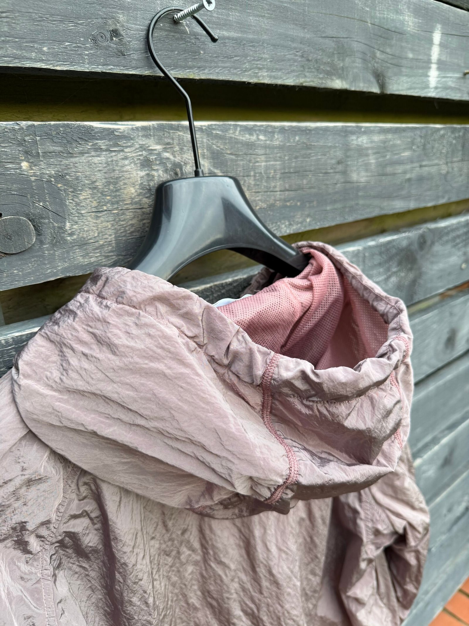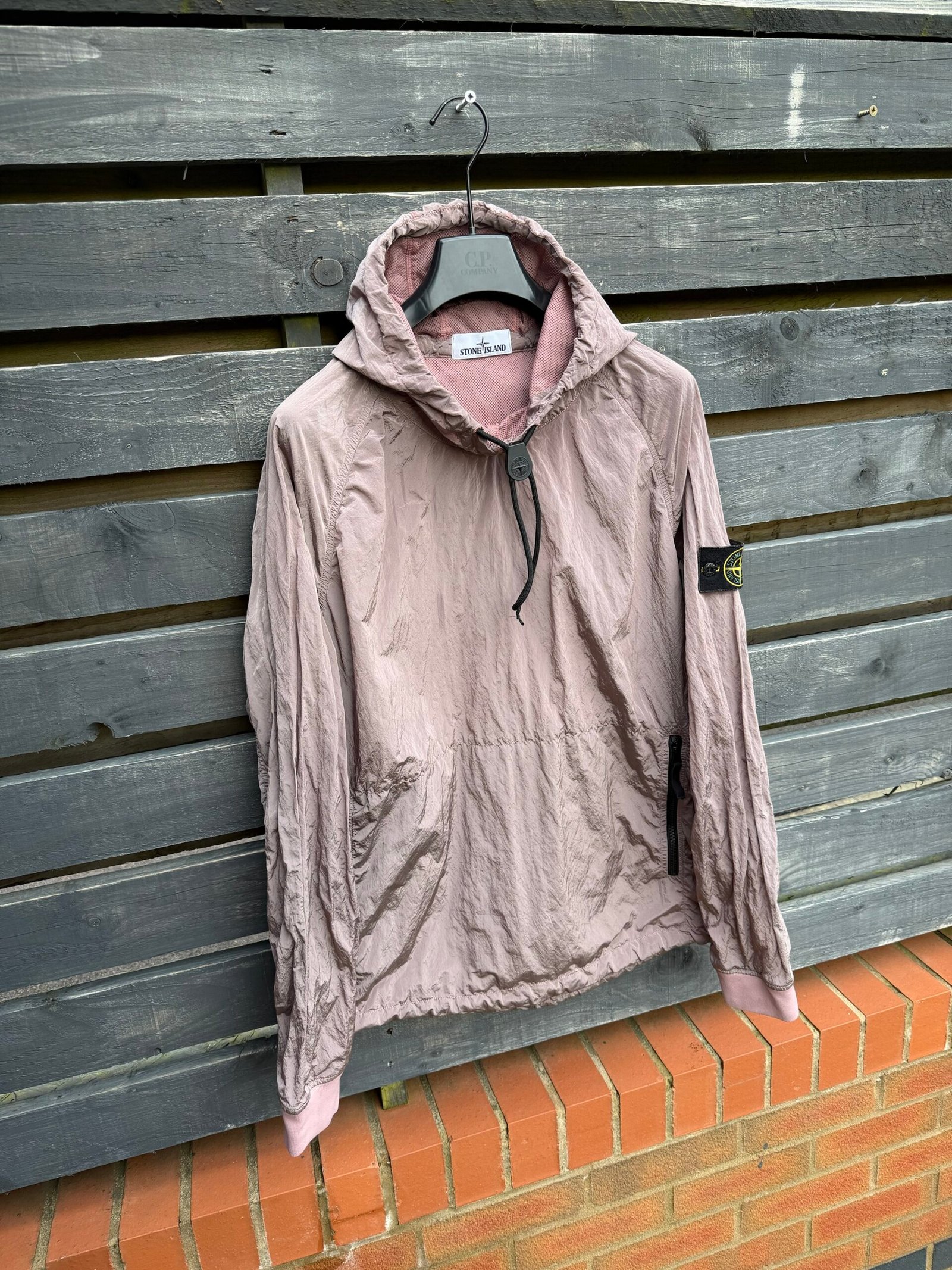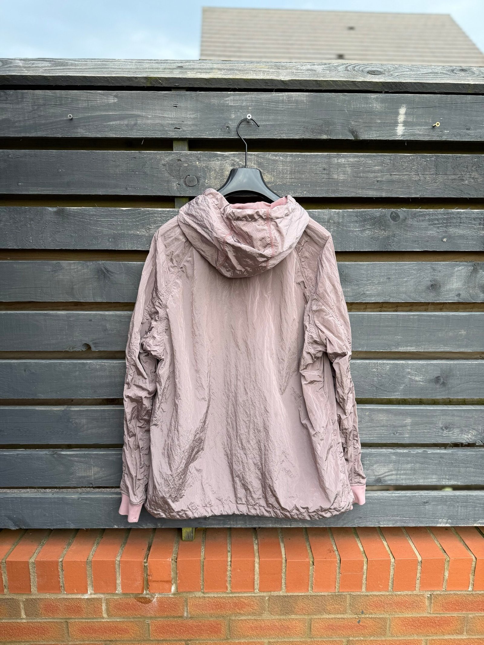 A standout lightweight smock from Stone Island crafted in their signature Nylon Metal fabric — giving a metallic, slightly iridescent surface that catches light with a subtle shine. It features a drawstring hood, raglan sleeves, a zip‑front pouch pocket, ribbed cuffs and mesh lining, plus the detachable Stone Island badge at the sleeve. Wind‑ and water‑resistant with an anti‑drop finish, this smock blends technical utility and streetwear attitude — perfect as a layering piece or transitional outerwear. Very good condition, water mark on the front can’t be seen in the light.