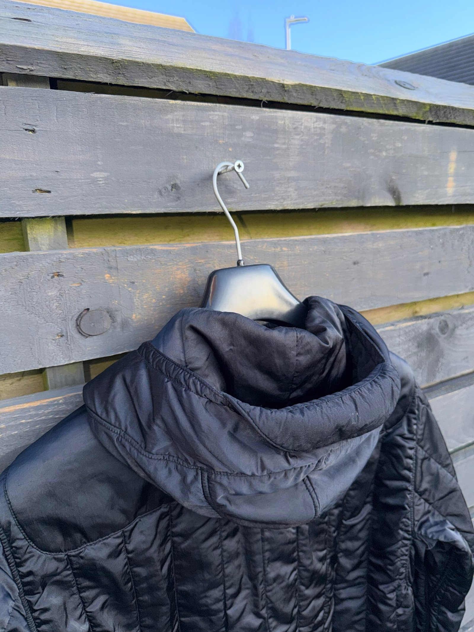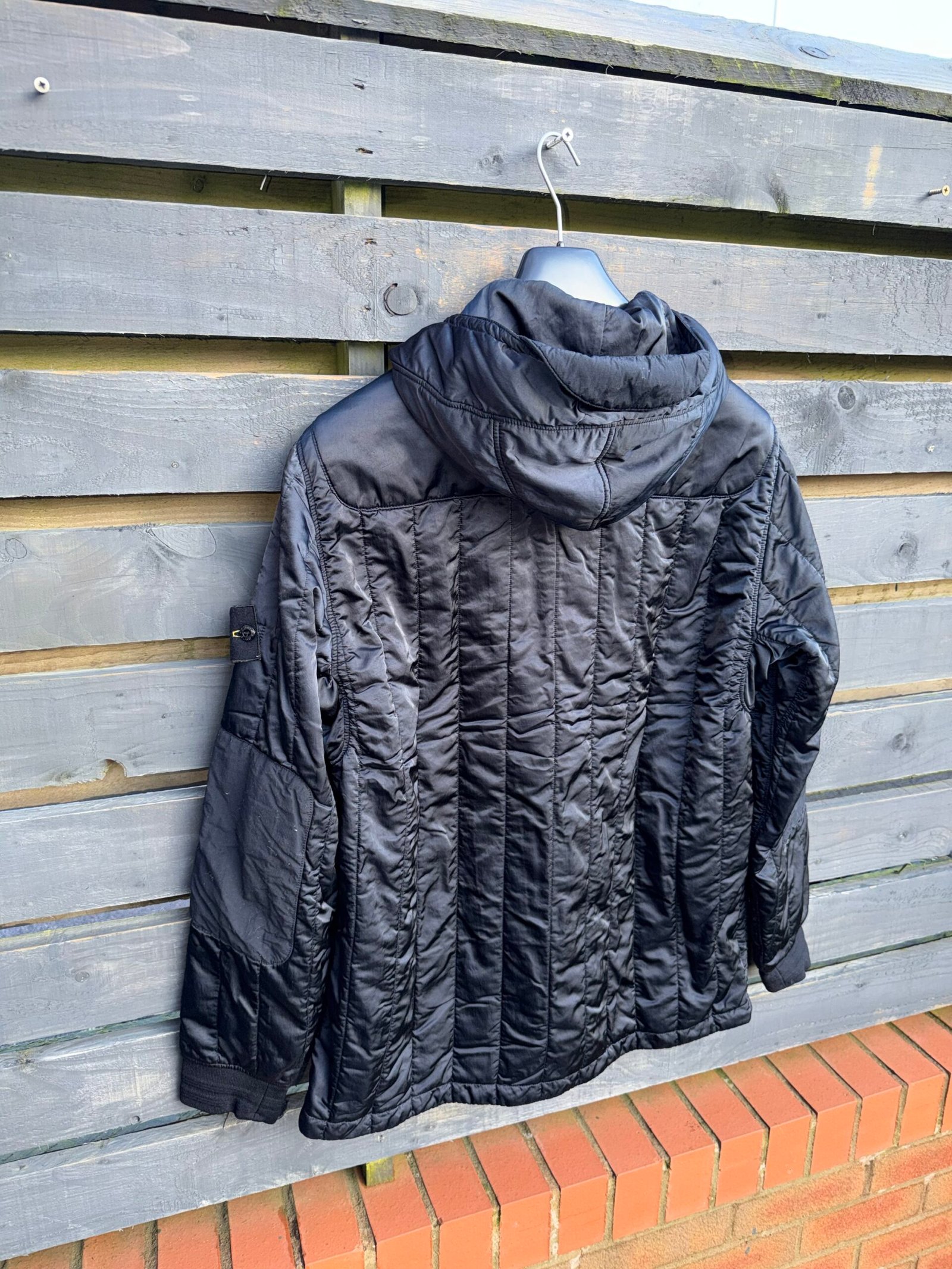 Premium outerwear crafted from durable Nylon Raso with lightweight quilted padding for added warmth. Features a classic smock silhouette, adjustable hood, functional front pocket detailing and the iconic removable compass badge to the sleeve. Clean, technical and built for everyday wear. Very good condition. Please Note this item is pre-owned and may show minor signs of wear.