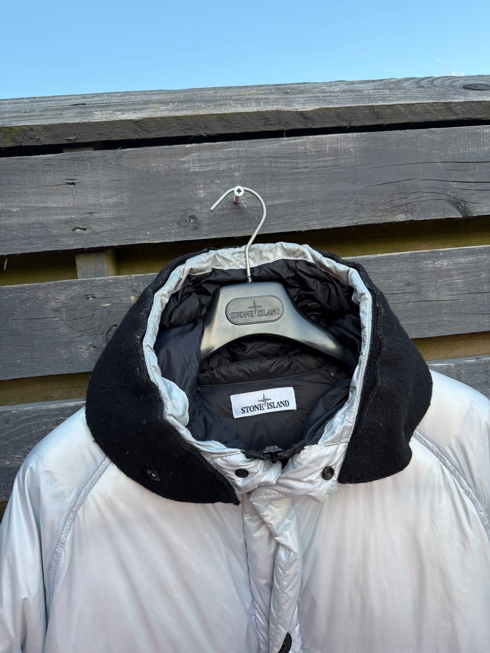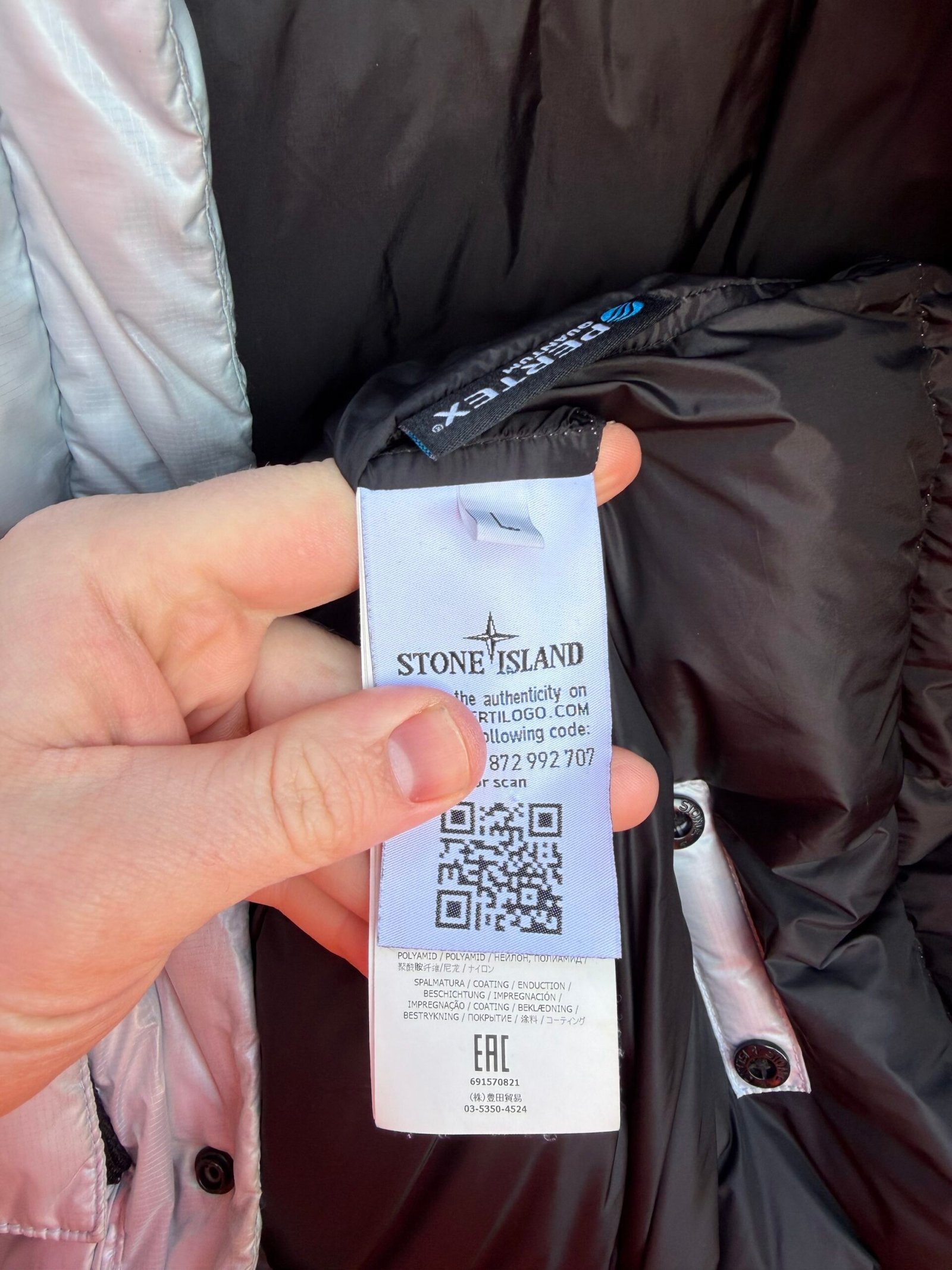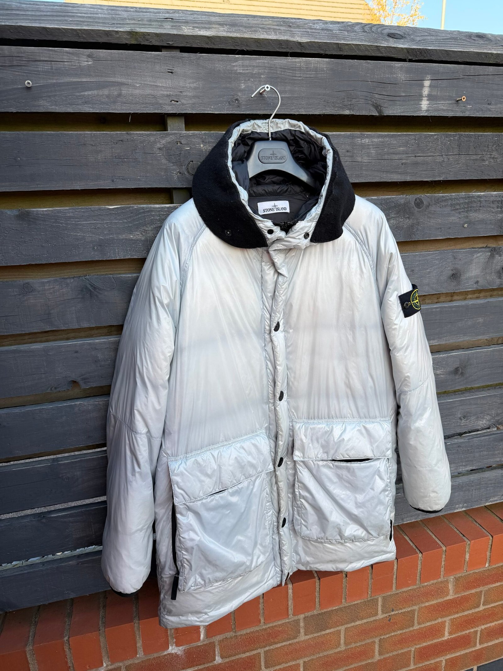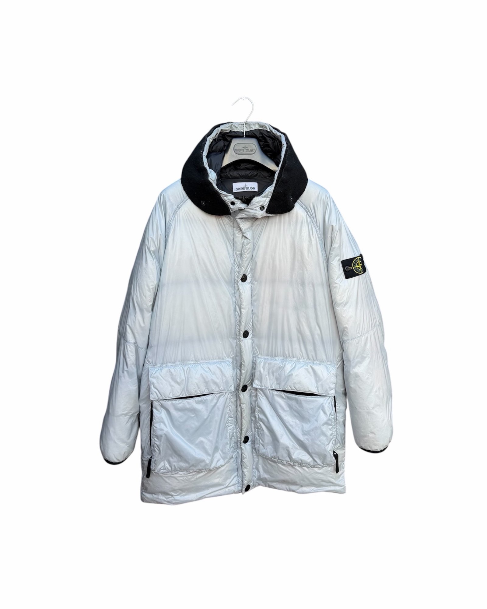 A super-light, high-performance down jacket built on Stone Island’s technical Pertex Quantum Y shell. It’s engineered from ultra‑strong, ripstop nylon with a DWR (durable water‑repellent) finish for wind resistance and light weather protection. Inside, it’s insulated with premium down via direct feather injection, giving warmth without bulk. The design includes a drawstring-adjustable hood and hem, elasticated cuffs, zip fastening, vertical pockets, and a detachable Stone Island compass badge on the sleeve. It’s breathable, packable, and made to balance function and sleek style. Worn,good condition.