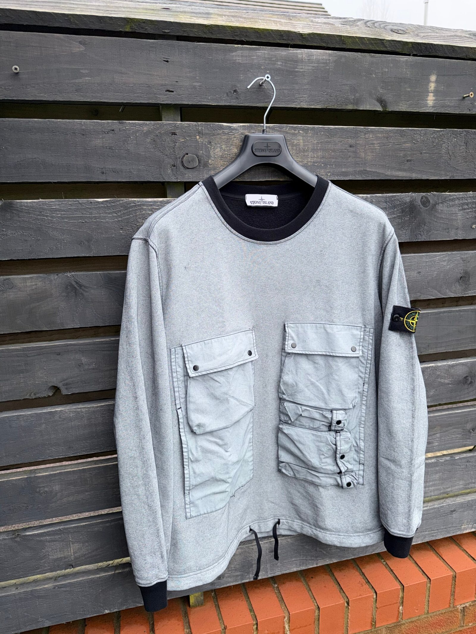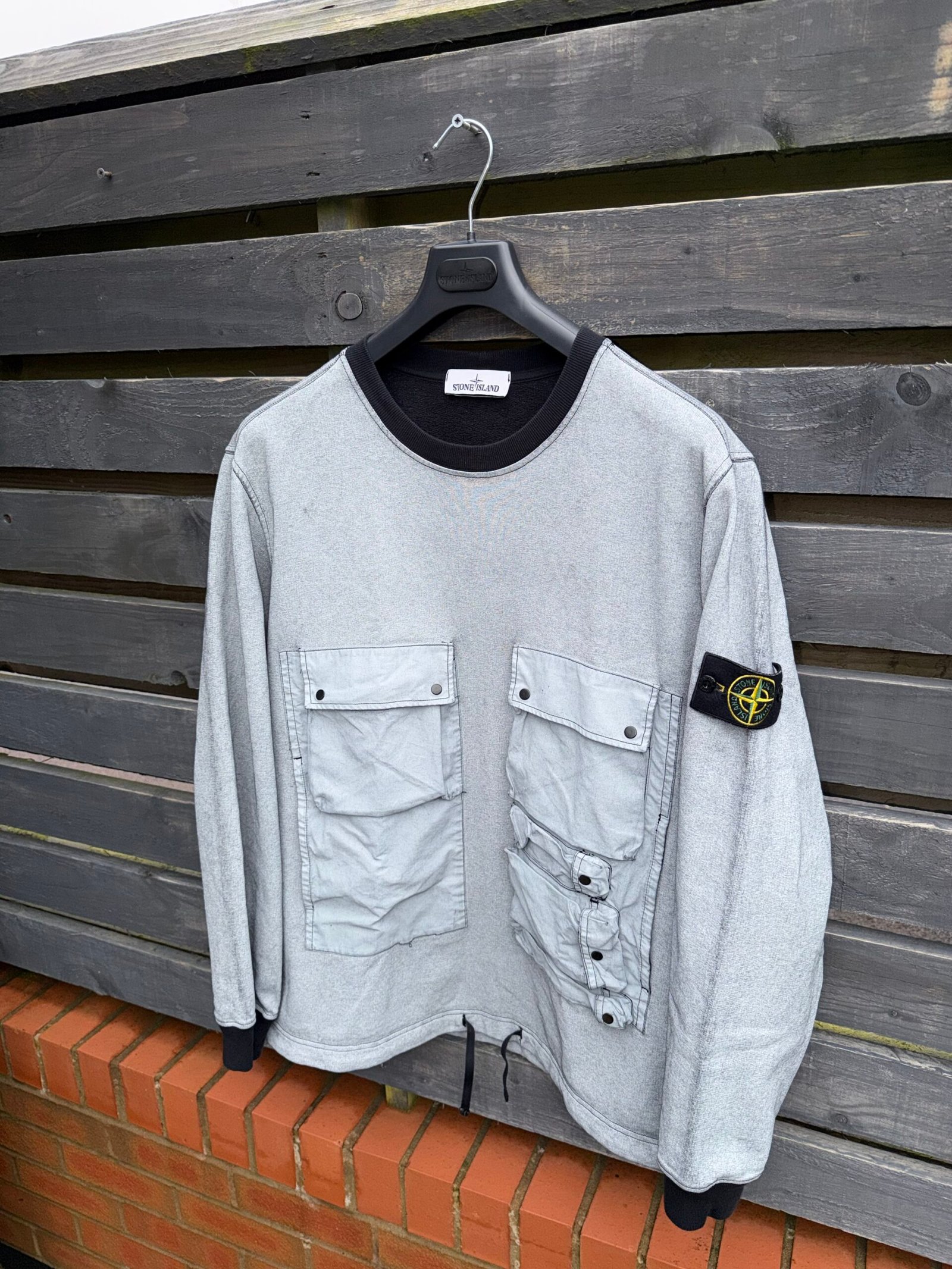 Stone Island Tela Placcata Sweatshirt crafted from a unique cotton base bonded with a metallic polyurethane film, giving it a distinctive coated finish. Known for its technical fabrication and experimental dye process, the Tela Placcata treatment creates subtle variation and depth throughout. Finished with classic Stone Island detailing, this piece blends utilitarian function with archive innovation. A highly sought-after example of the brand’s material research. Immaculate, Like new. Please Note this item is pre-owned and may show minor signs of wear.