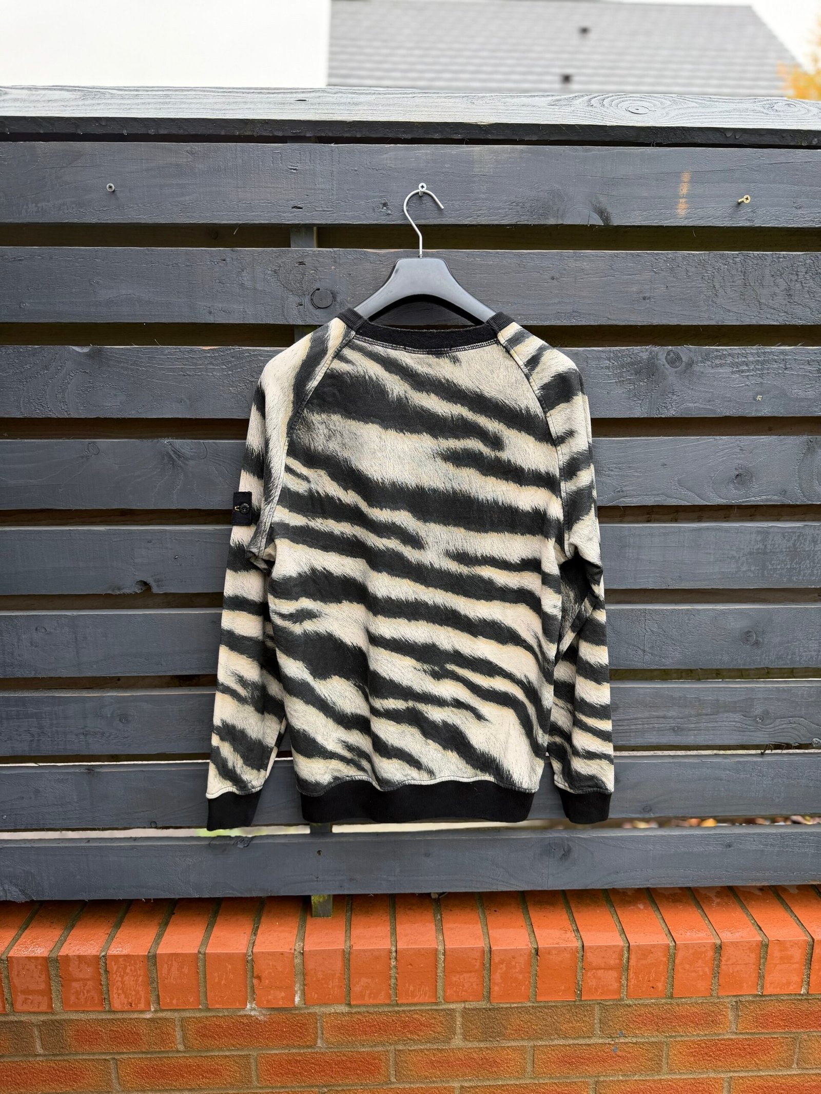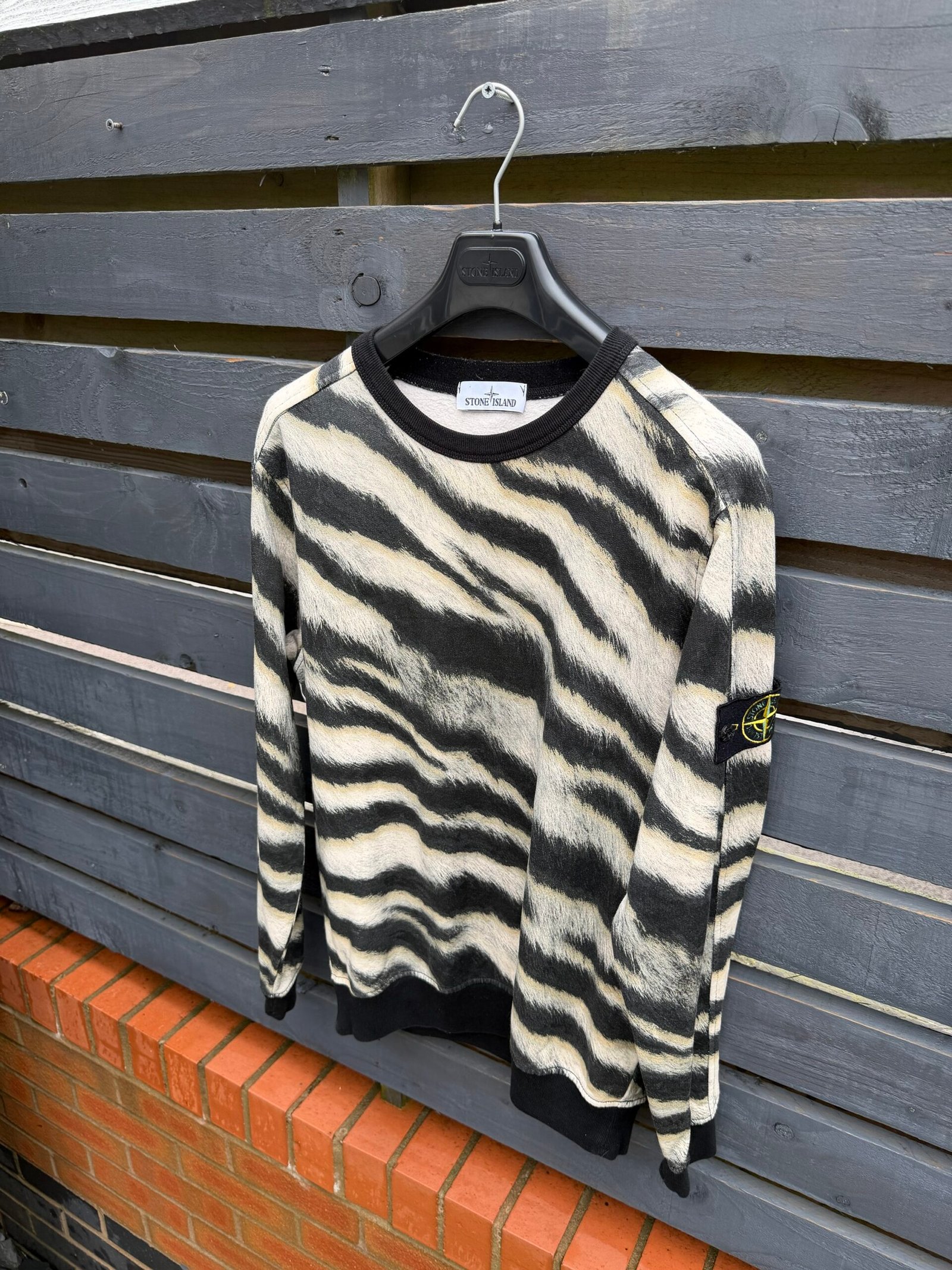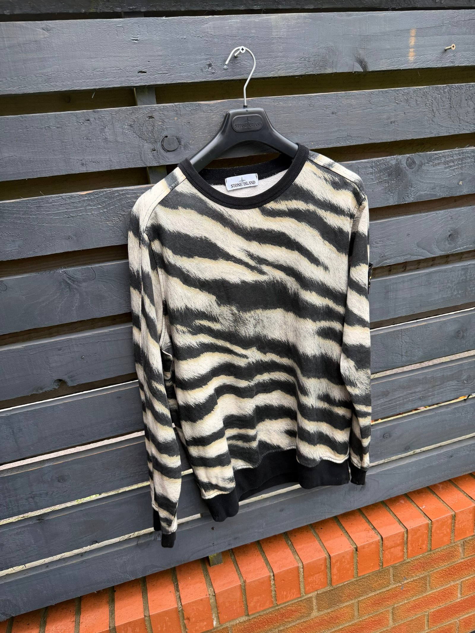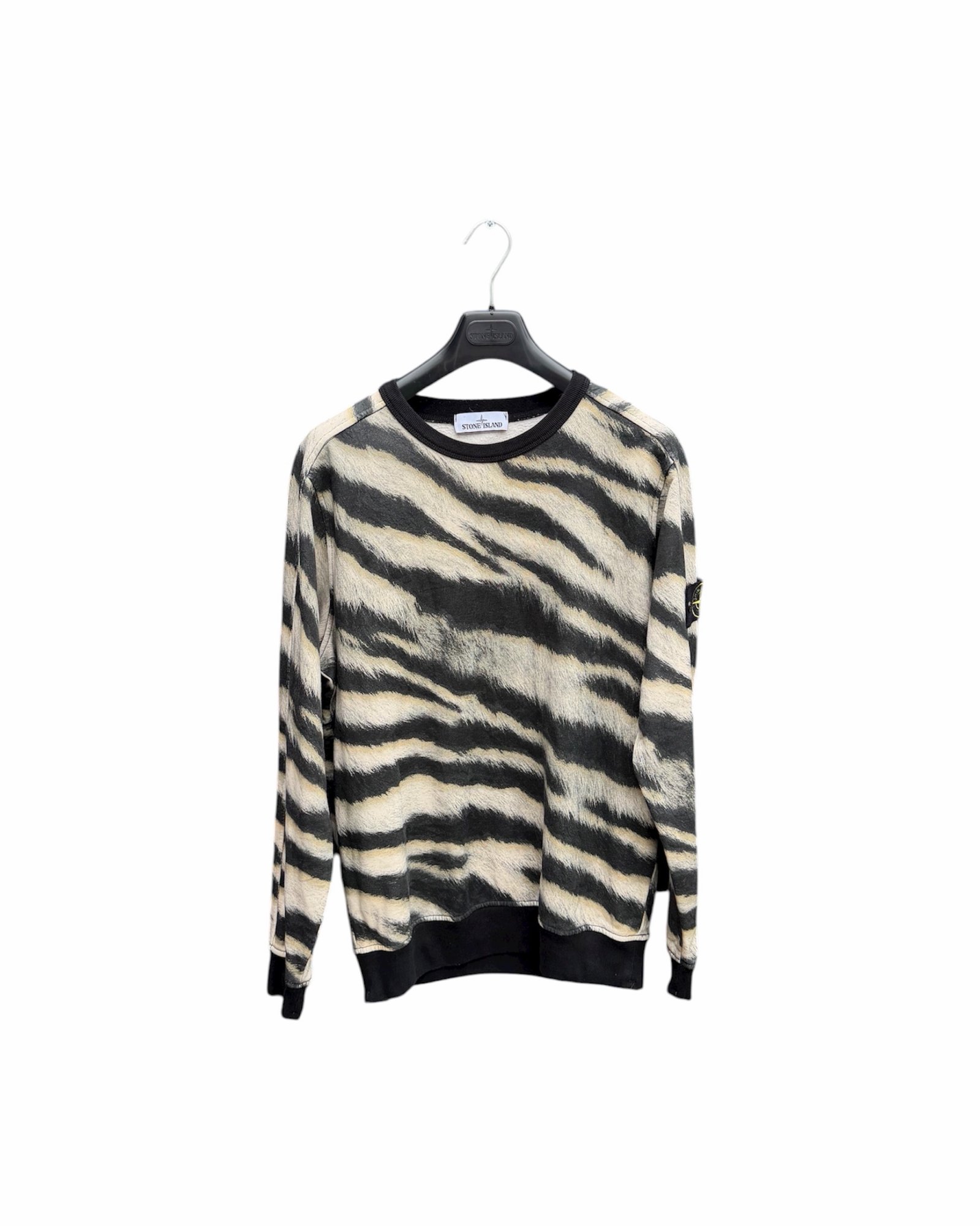 This standout sweatshirt taps into Stone Island’s archive of bold print innovation. The “Tiger Camo” motif was introduced in the AW18 capsule, inspired by the rare white tiger’s fur and rendered in an intricate six-colour printing process. Immaculate condition.